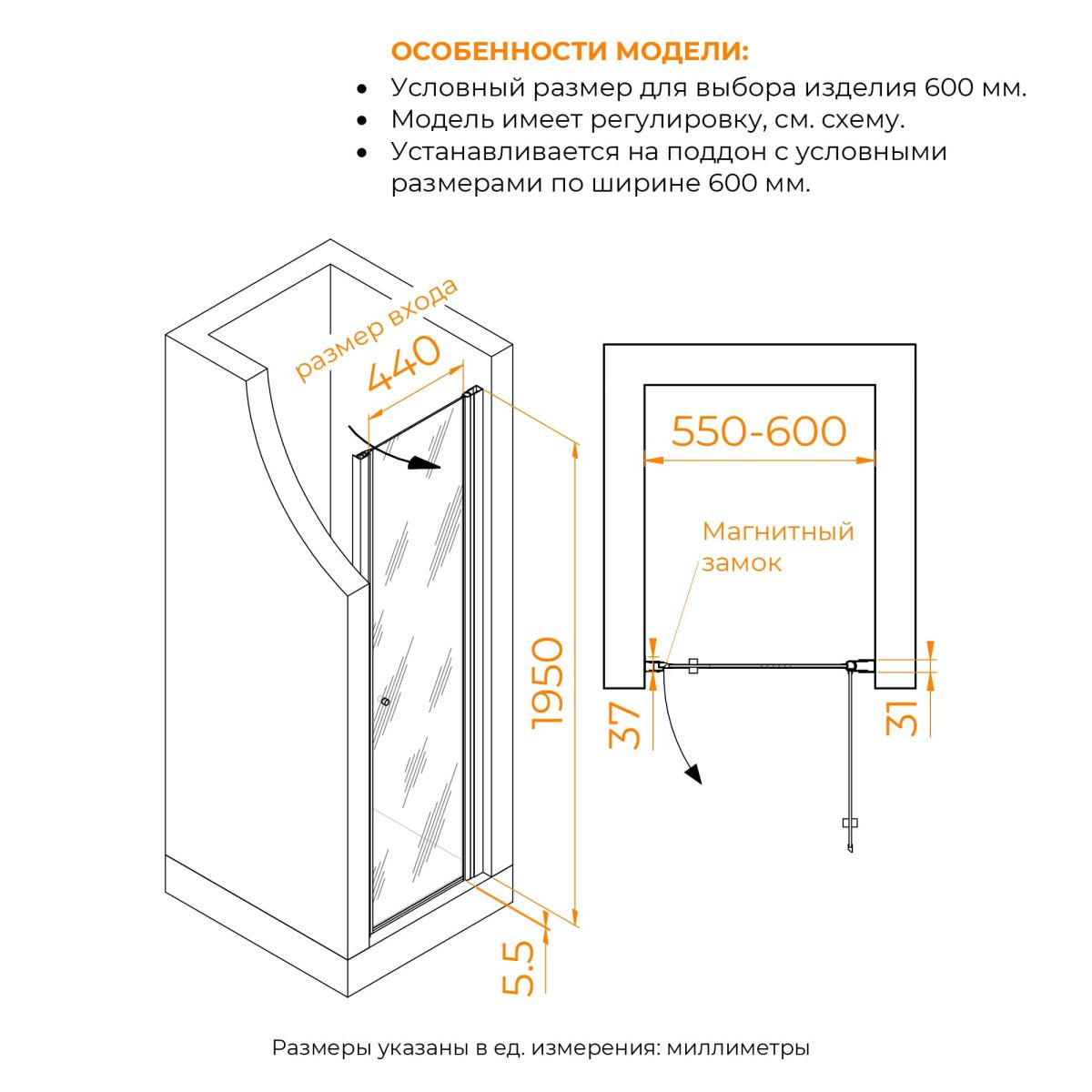 Душевая дверь Dolphin TN-03 - это надежное и прочное изделие, которое отлично подходит для оснащения вашей ванной комнаты. Эта душевая дверь имеет толщину стекла 6 мм, что обеспечивает надежную защиту от ударов и трещин. Дверь оснащена прозрачным стеклом, которое позволяет создать прозрачный и светлый интерьер ванной комнаты.