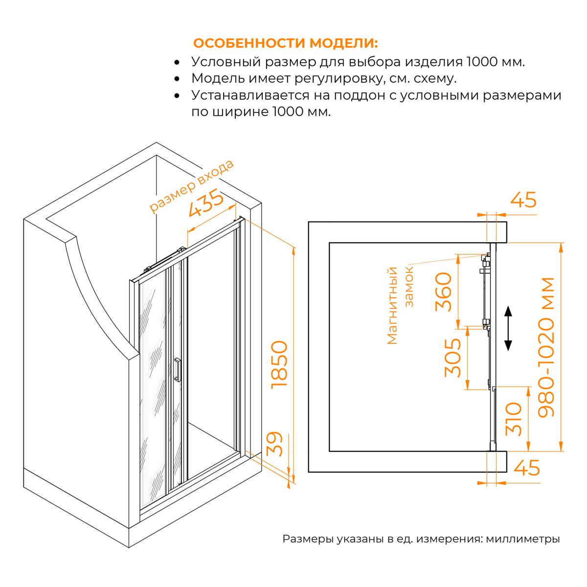 Ширина: 800 мм, 900 мм, 1000 мм, 1100 мм; - регулировка изделия - 40 мм. (-20 мм + 20 мм)