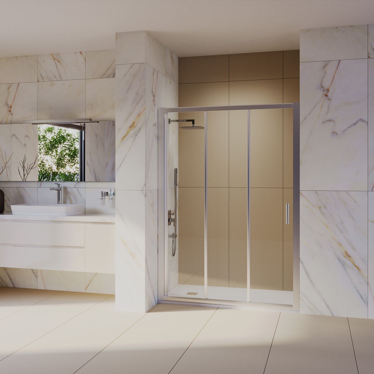 Душевая дверь трехстворчатая, стеклянная, раздвижная, в нишу с магнитным замком - RGW CL-111 Трехсекционная душевая дверь, премиального класса RGW- CL-111 – Серия – Classik - это каркасная телескопическая конструкция двери, а именно сочетание неподвижного полотна и двух подвижных полотен, которые скользят вдоль друг друга, заходя за стационарное полотно. Дверь для душа- купе, герметично закрывает проем в нише и за счет трех секций дает даже при малых размерах достаточно просторный вход. Премиальная дверь в нишу из стекла и профиля хром обладает ручкой скоба и плавным откатным ходом. Дверь в душ устанавливается в нишу на душевой поддон или пол, выложенный плиткой и установленным душевым трапом. Душевая откатная на три полотна дверь RGW Cl-111 – реверсивная установка, монтаж на любую сторону открытия двери. Возможна комплектация боковой панелью для образования угла. а.