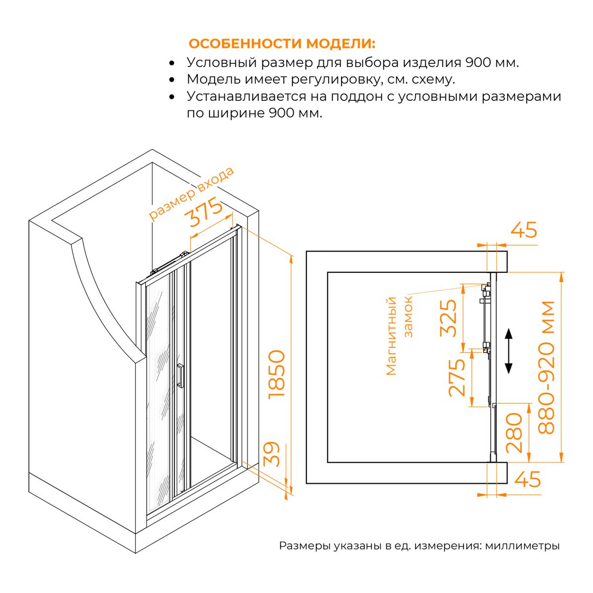 Ширина: 800 мм, 900 мм, 1000 мм, 1100 мм; - регулировка изделия - 40 мм. (-20 мм + 20 мм)