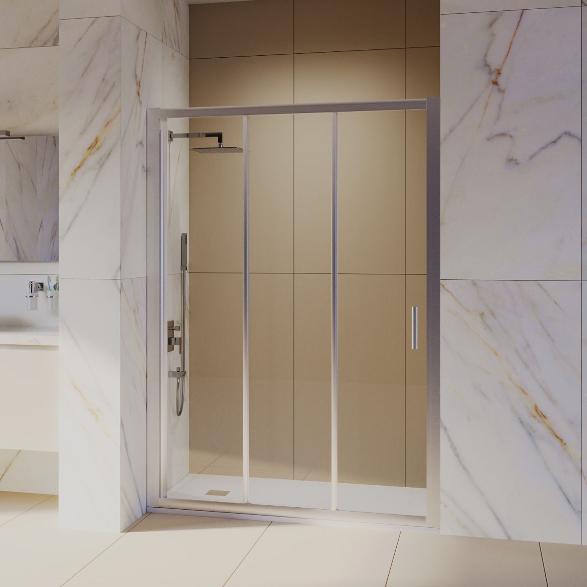 Душевая дверь трехстворчатая, стеклянная, раздвижная, в нишу с магнитным замком - RGW CL-111 Трехсекционная душевая дверь, премиального класса RGW- CL-111 – Серия – Classik - это каркасная телескопическая конструкция двери, а именно сочетание неподвижного полотна и двух подвижных полотен, которые скользят вдоль друг друга, заходя за стационарное полотно. Дверь для душа- купе, герметично закрывает проем в нише и за счет трех секций дает даже при малых размерах достаточно просторный вход. Премиальная дверь в нишу из стекла и профиля хром обладает ручкой скоба и плавным откатным ходом. Дверь в душ устанавливается в нишу на душевой поддон или пол, выложенный плиткой и установленным душевым трапом. Душевая откатная на три полотна дверь RGW Cl-111 – реверсивная установка, монтаж на любую сторону открытия двери. Возможна комплектация боковой панелью для образования угла. а.