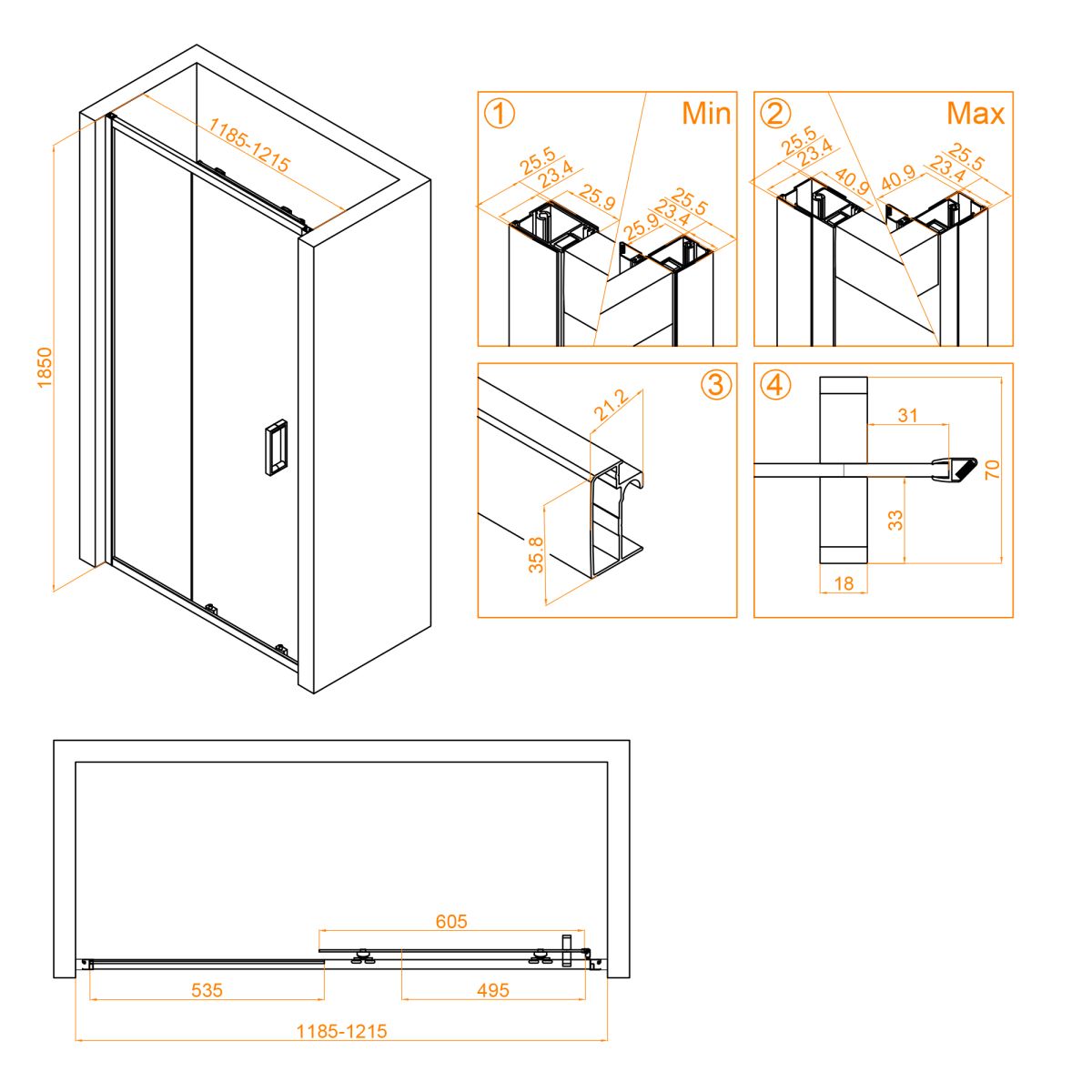 Дверь имеет общую высоту 1850 мм, что подходит для большинства стандартных ванных комнат. Двойные регулируемые ролики обеспечивают плавное и бесшумное открытие и закрытие двери. Благодаря роликовому подшипнику дверь двигается легко и плавно.