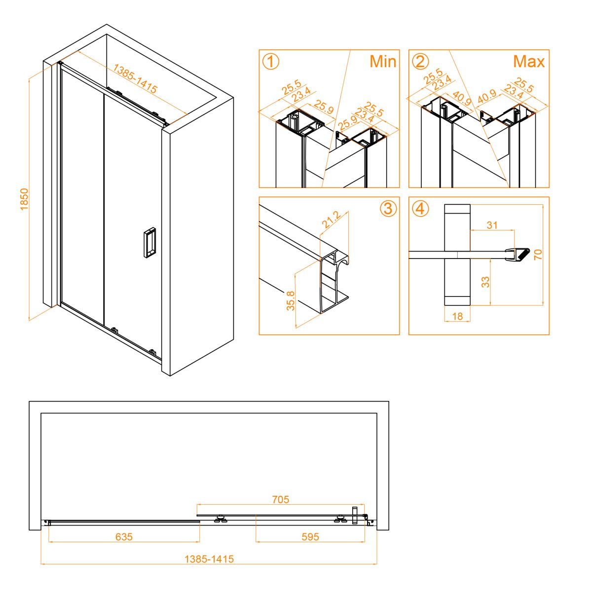 Дверь имеет общую высоту 1850 мм, что подходит для большинства стандартных ванных комнат. Двойные регулируемые ролики обеспечивают плавное и бесшумное открытие и закрытие двери. Благодаря роликовому подшипнику дверь двигается легко и плавно.