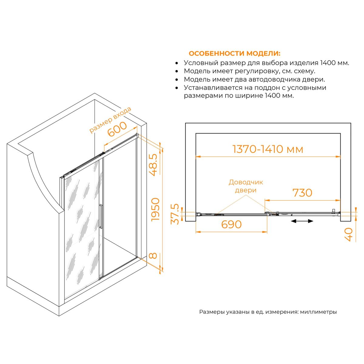 Высота общая двери составляет 1950 мм, что позволяет использовать ее даже в помещениях с высокими потолками. Двойные регулируемые ролики обеспечивают плавное и бесшумное скольжение двери при открытии и закрытии. Конструкция дверей раздвижная, что позволяет сэкономить место в ванной комнате.