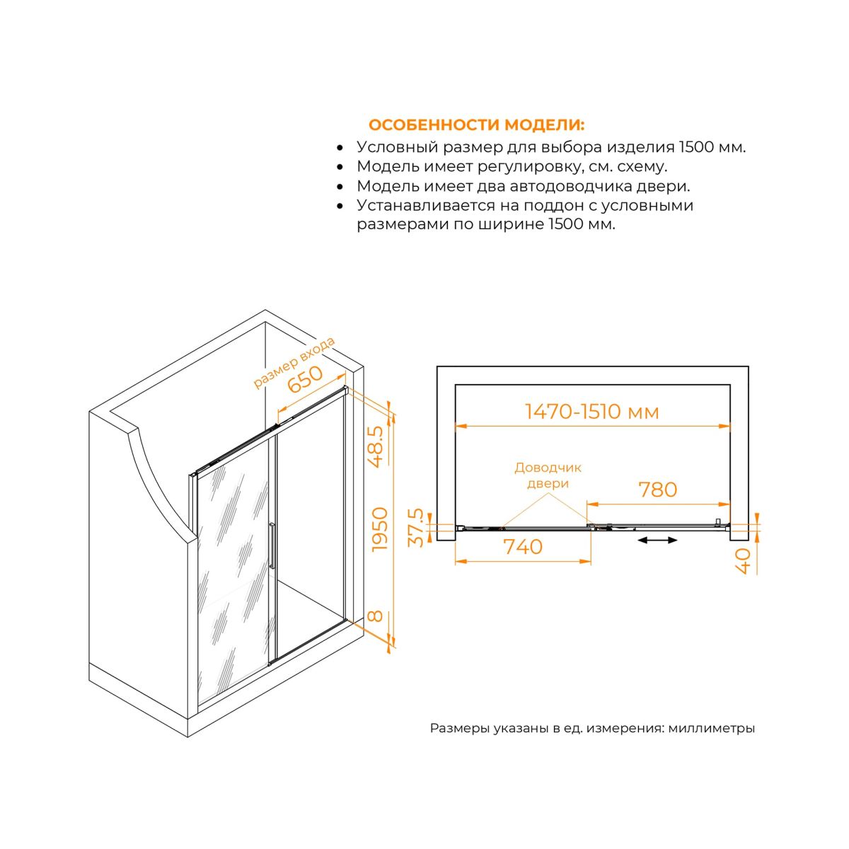 Высота общая двери составляет 1950 мм, что позволяет использовать ее даже в помещениях с высокими потолками. Двойные регулируемые ролики обеспечивают плавное и бесшумное скольжение двери при открытии и закрытии. Конструкция дверей раздвижная, что позволяет сэкономить место в ванной комнате.