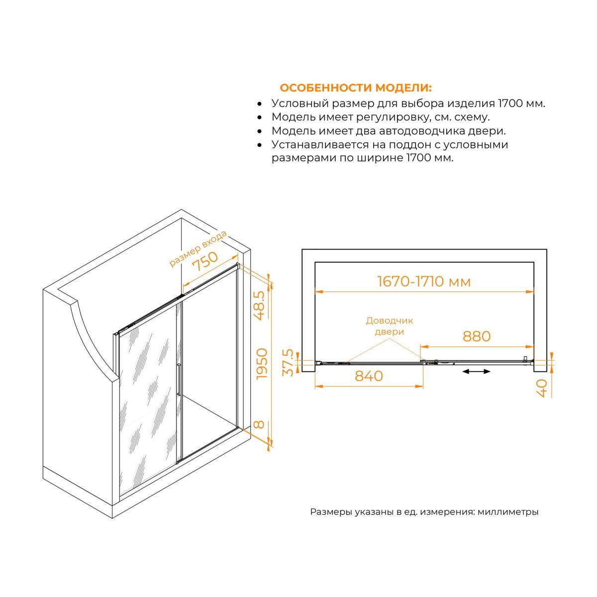 Высота общая двери составляет 1950 мм, что позволяет использовать ее даже в помещениях с высокими потолками. Двойные регулируемые ролики обеспечивают плавное и бесшумное скольжение двери при открытии и закрытии. Конструкция дверей раздвижная, что позволяет сэкономить место в ванной комнате.