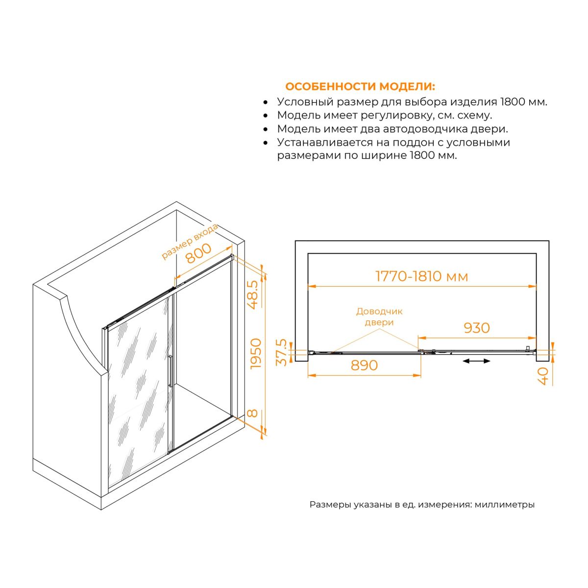 Высота общая двери составляет 1950 мм, что позволяет использовать ее даже в помещениях с высокими потолками. Двойные регулируемые ролики обеспечивают плавное и бесшумное скольжение двери при открытии и закрытии. Конструкция дверей раздвижная, что позволяет сэкономить место в ванной комнате.