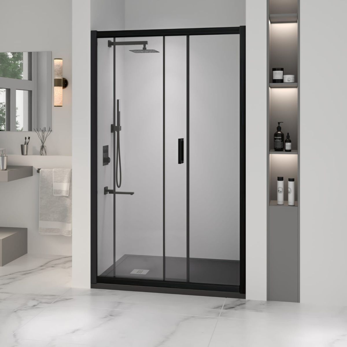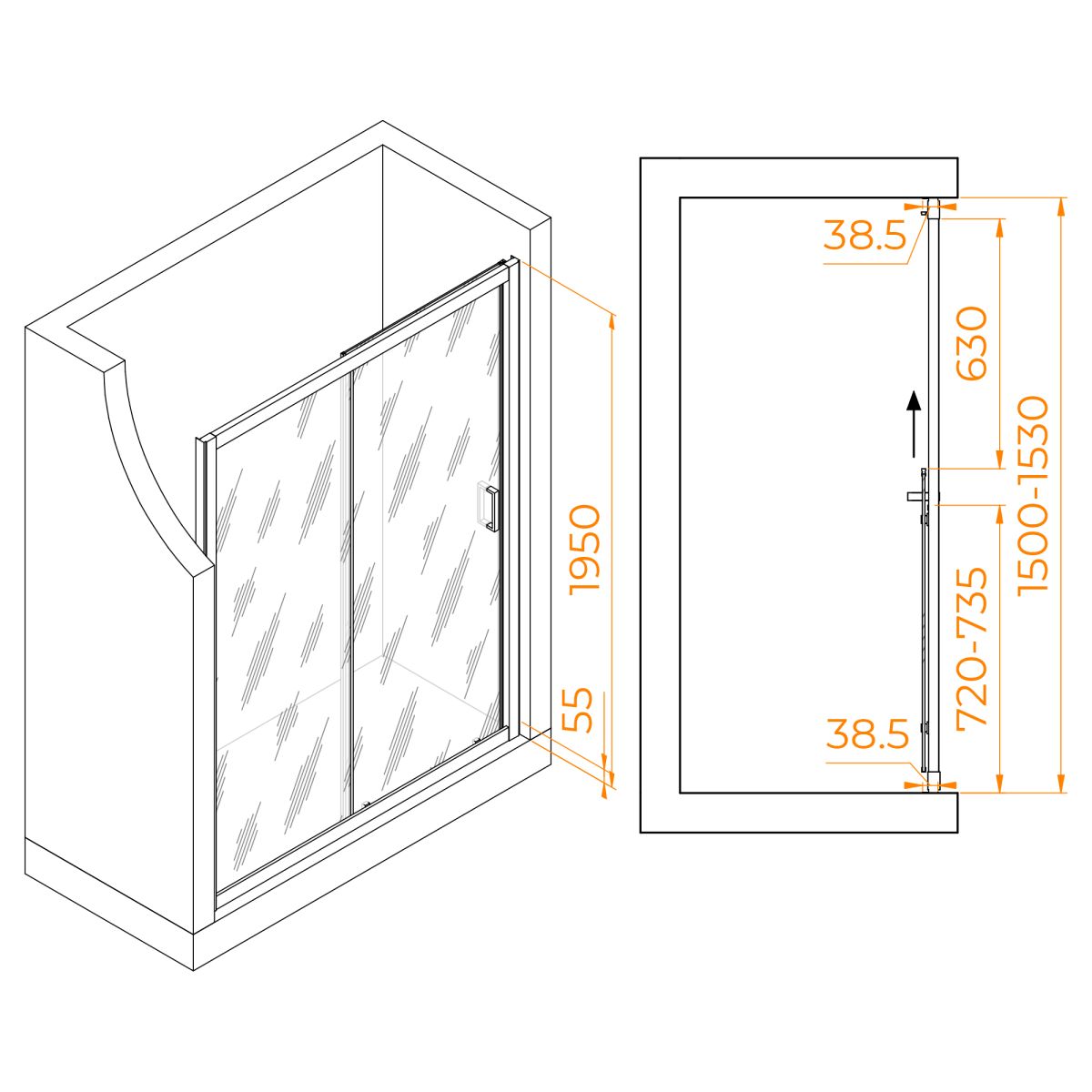Профиль двери выполнен из анодированного алюминия черного цвета, что придает ей элегантный и современный вид. Высота общая двери составляет 1950 миллиметров. Конструкция дверей раздвижная, что позволяет сэкономить место в ванной комнате.
