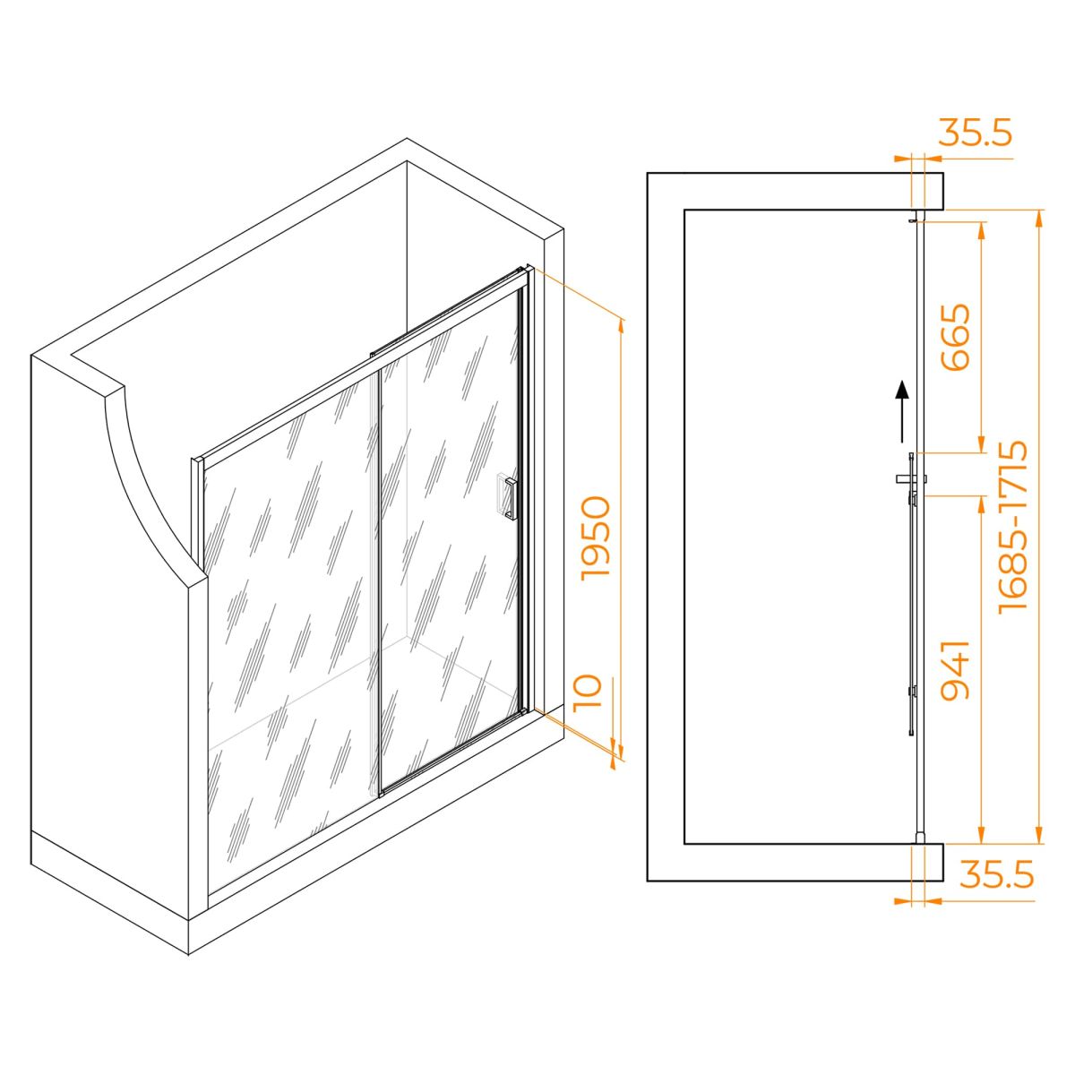 Профиль цвета хром из анодированного алюминия гарантирует прочность и долговечность. Высота двери составляет 1950 мм, а класс утечки 2 предотвращает попадание воды на пол.