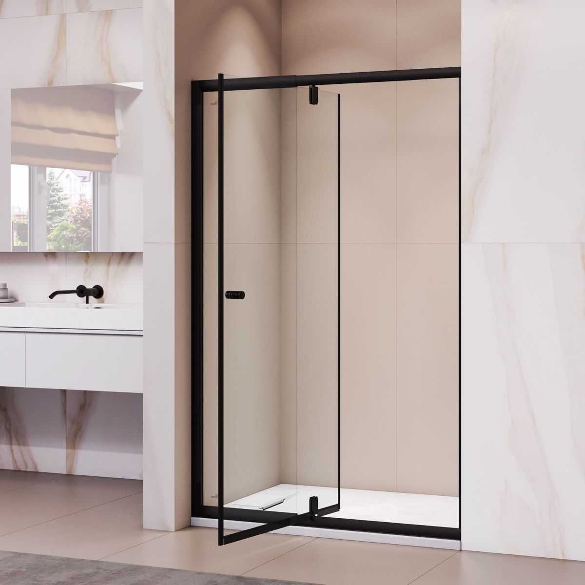Водонепроницаемые стальные петли обеспечивают прочное крепление двери и высокую надежность, что делает эту душевую дверь идеальным выбором для каждого дома. Общая высота конструкции - 1850 мм.