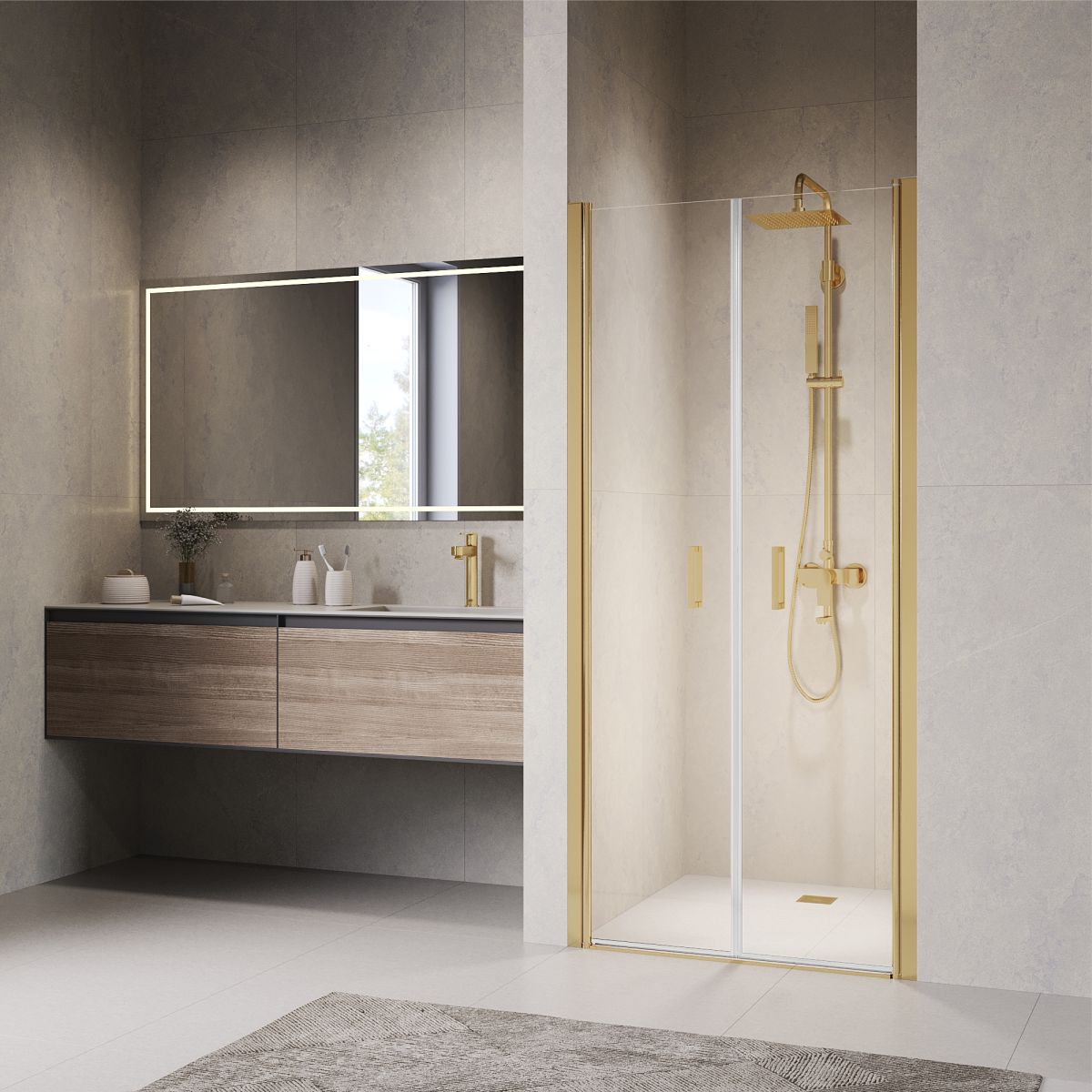 Двух створчатая маятниковая душевая дверь PA-104 с механизмом "Gravity Loop" представлена в популярных цветовых решениях: хром, черный и золото brush.