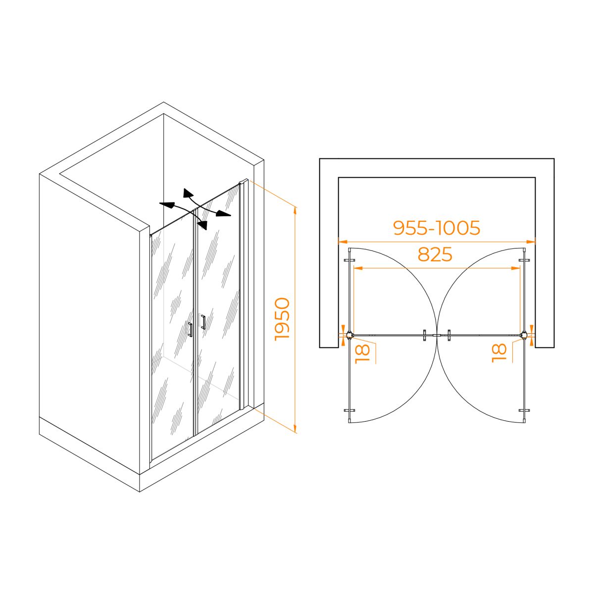 Двух створчатая маятниковая душевая дверь PA-104 с механизмом "Gravity Loop" представлена в популярных цветовых решениях: хром, черный и золото brush.