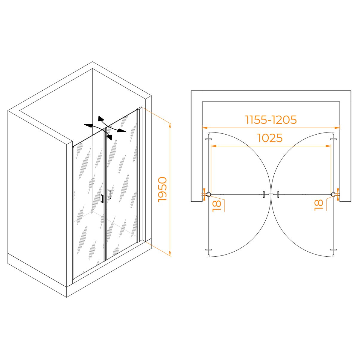 Двух створчатая маятниковая душевая дверь PA-104 с механизмом "Gravity Loop" представлена в популярных цветовых решениях: хром, черный и золото brush.