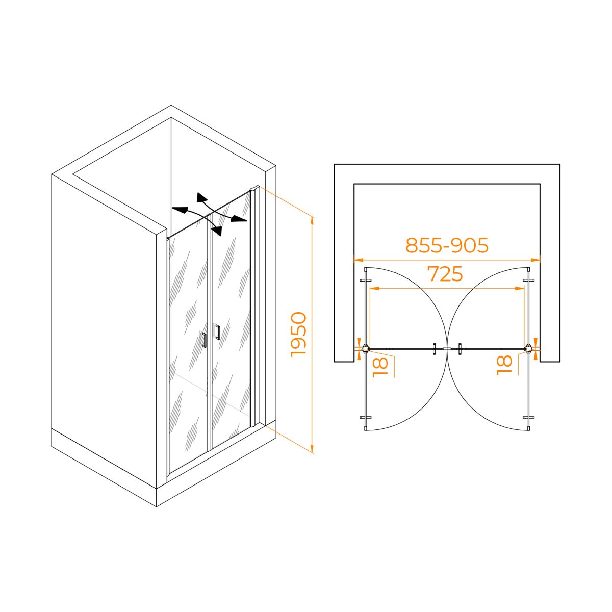 Двух створчатая маятниковая душевая дверь PA-104 с механизмом "Gravity Loop" представлена в популярных цветовых решениях: хром, черный и золото brush.
