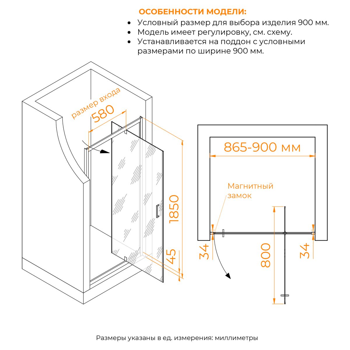 Водонепроницаемые стальные петли гарантируют, что вода останется внутри душа, предотвращая любые утечки или повреждение водой пола вашей ванной комнаты. Общая высота душевой двери составляет 1850 мм, что обеспечивает достаточно места даже для самых высоких людей.
