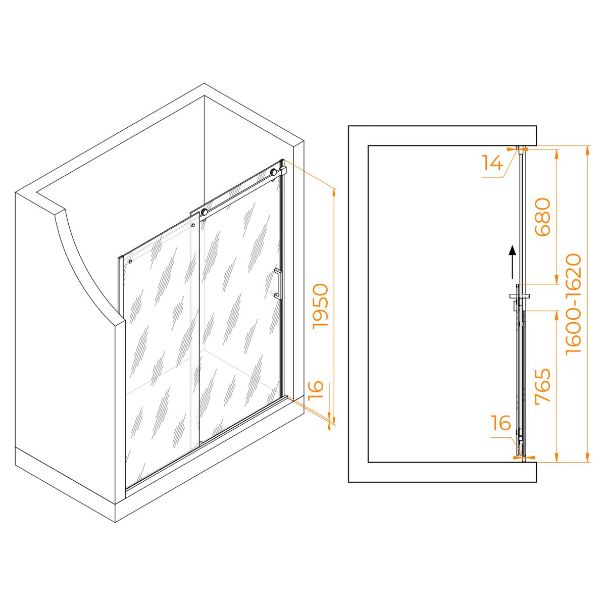 Общая высота двери составляет 1950 мм, позволяя ей легко пропускать даже самых высоких людей. Конструкция раздвижных дверей делает использование двери удобнее и экономит место в ванной комнате. Двойные ролики плавно и бесшумно открывают и закрывают дверь.