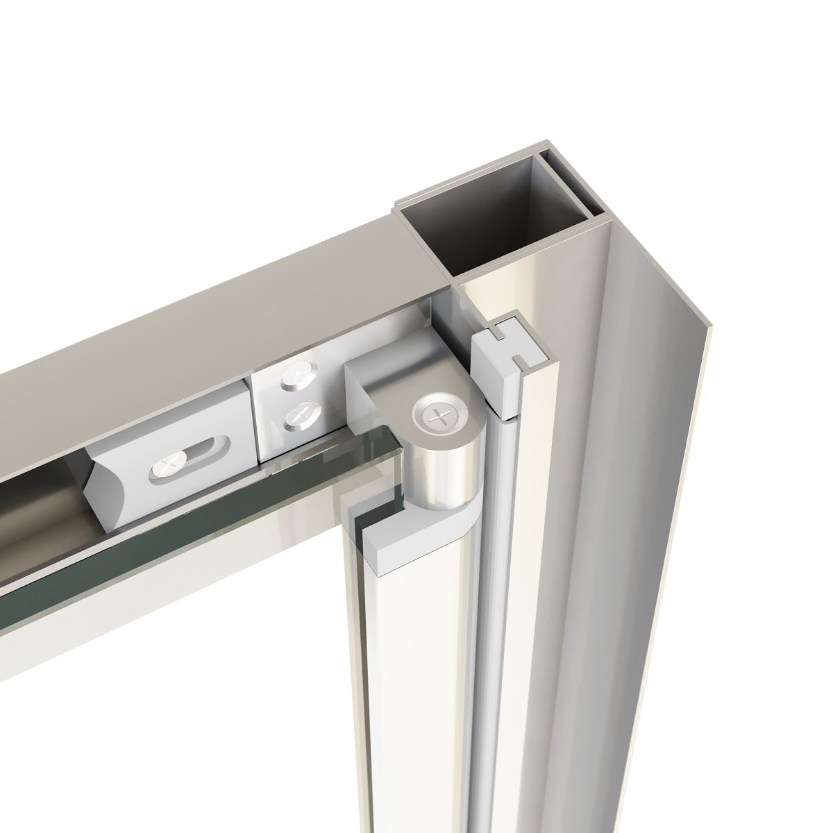 Петли с магнитом скрепляют два стекла. Магниты необходимы в данной конструкции для полной герметичности двери. Конструктивная связка «петля-магнит, магнит-профиль» обеспечивает максимальную герметичность изделия на протяжении всего срока эксплуатации душевой двери. Модель имеет фиксатор, который смягчает удар ролика при открытии.