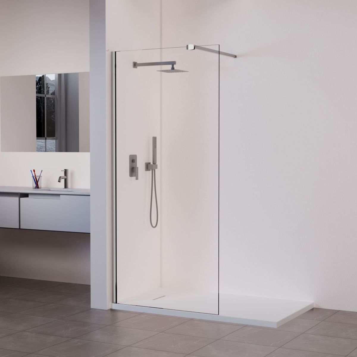 Перегородка изготовлена из закаленного стекла толщиной 10 мм, что обеспечивает надежность и долговечность изделия. Прозрачное стекло позволяет вам наслаждаться свежими ощущениями во время принятия душа, создавая визуальное пространство и эффект простора в ванной комнате. Благодаря анодированному алюминиевому профилю цвета хром, перегородка идеально сочетается со стилем вашей ванной комнаты и добавляет элегантность и современность в интерьер.