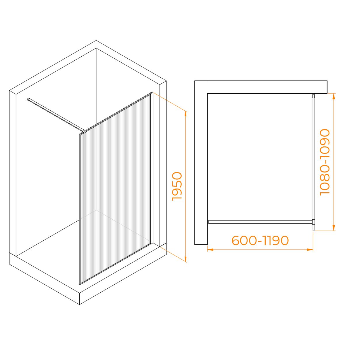 Эта стеклянная душевая перегородка высотой 1950 мм создает уникальное душевое пространство, визуально увеличивая площадь ванной комнаты. Конструкция крепится к стене с помощью пристенного соединительного профиля и штанги держателя.
