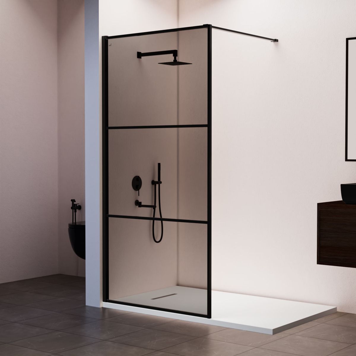 Душевая перегородка изготовлена из закаленного стекла 8 мм. Стекло имеет высокую степень прочности и блеска!