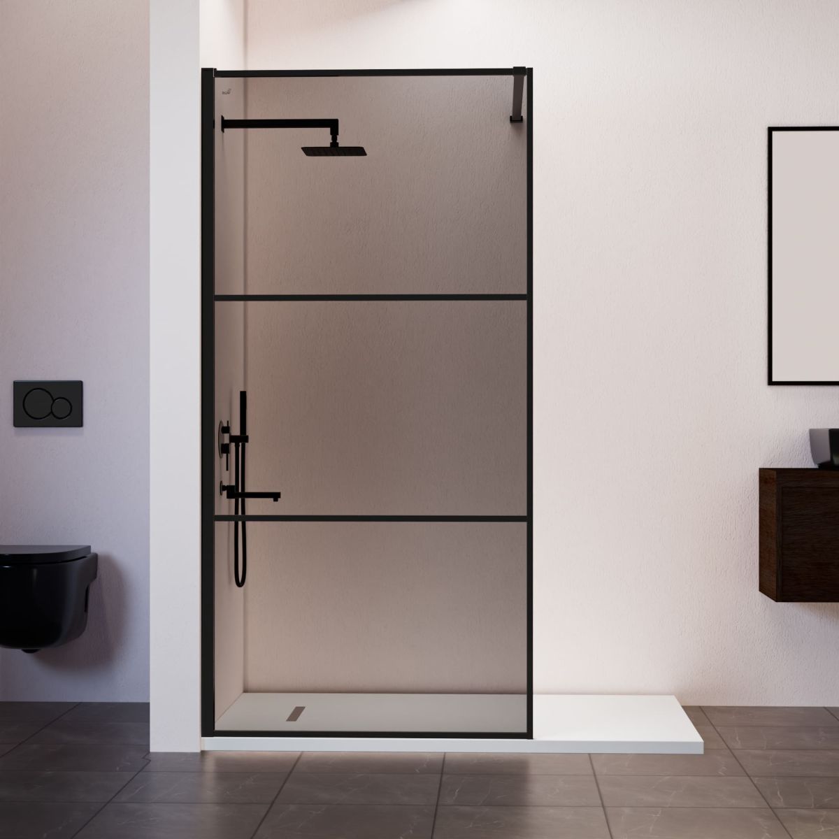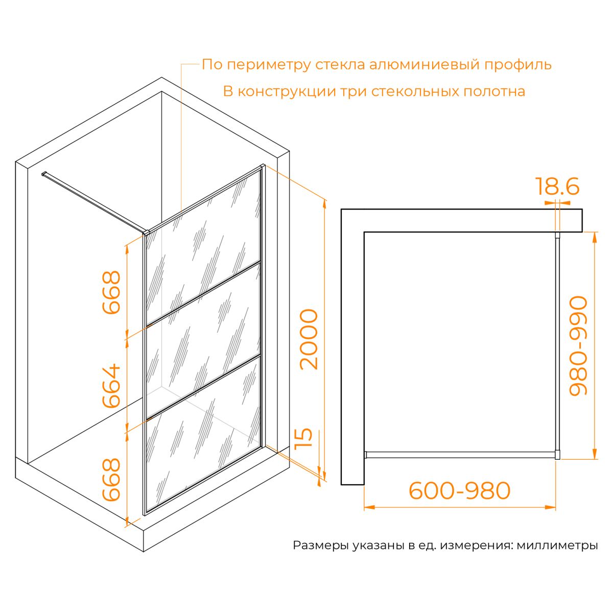 Душевая перегородка состоит из 3-х стекольных полотен (8мм), которые обрамлены изящным анодированным алюминиевым профилем!