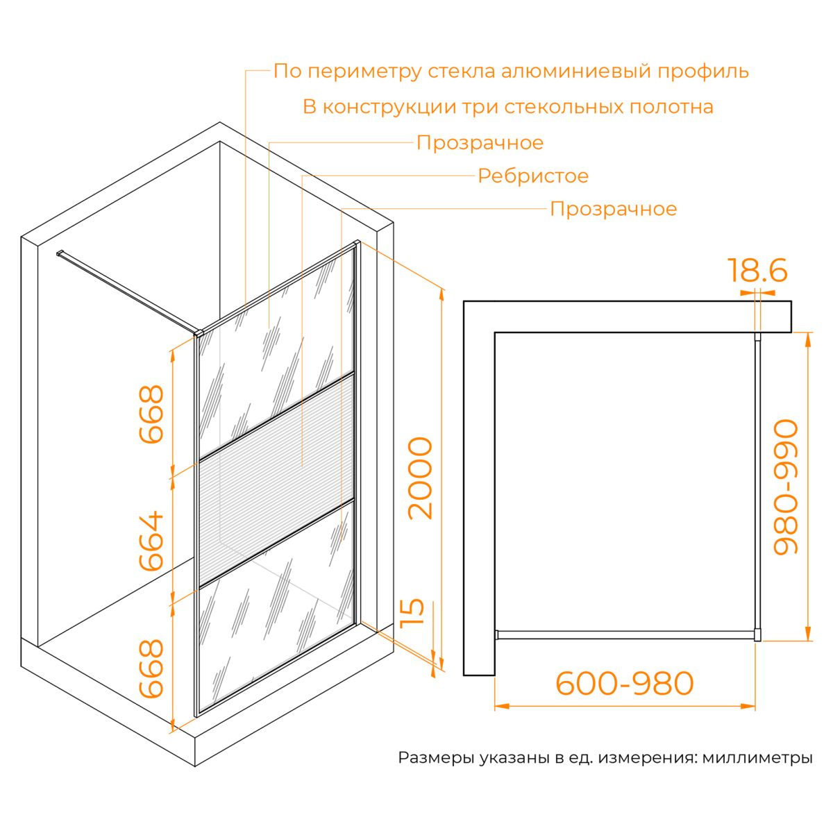 Душевая перегородка состоит из 3-х стекольных полотен (8мм), которые обрамлены изящным анодированным алюминиевым профилем!