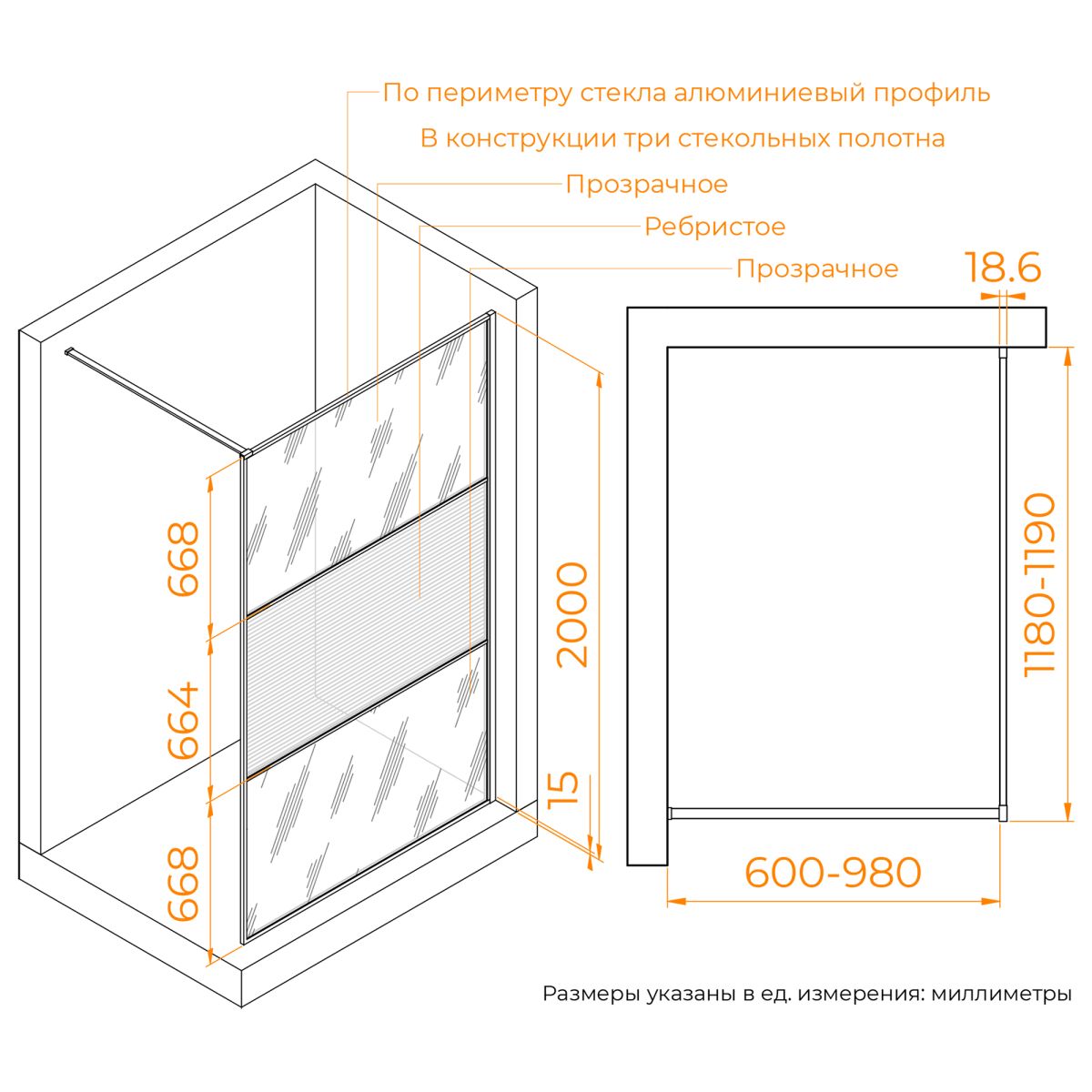 Штанга из стали S304, крепится к стене, она обеспечивает стабильность душевого ограждения. Длина стальной штанги 1000 мм, при этом ее всегда можно укоротить путем обычной подрезки.