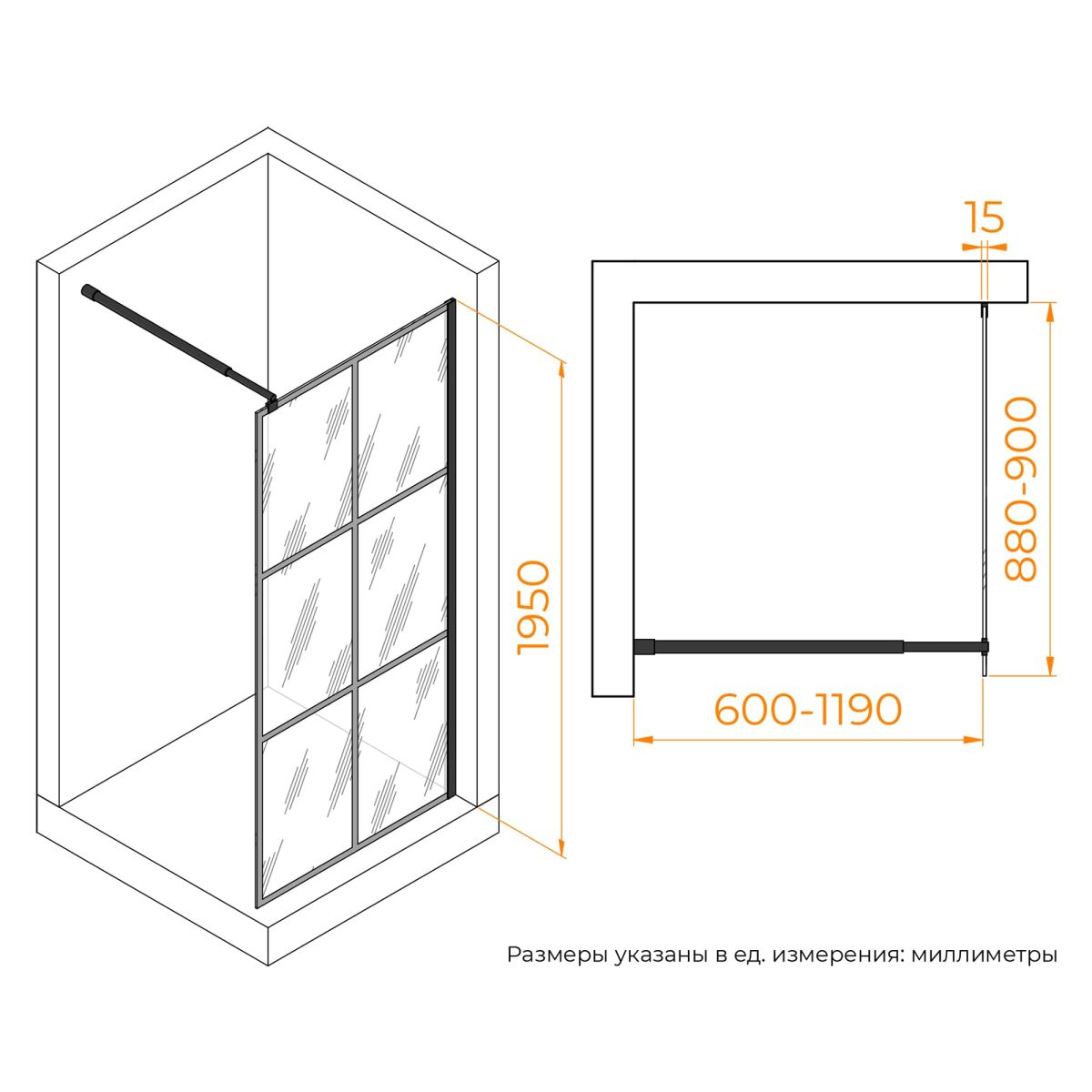 Толщина стекла составляет 8 мм, что обеспечивает высокую прочность и гарантирует безопасность использования. Исполнение стекла прозрачное с рисунком, который нанесён методом шелкографии. Пристенный профиль перегородки выполнен из качественного анодированного алюминия и имеет черный цвет, что отлично сочетается с большинством интерьеров.