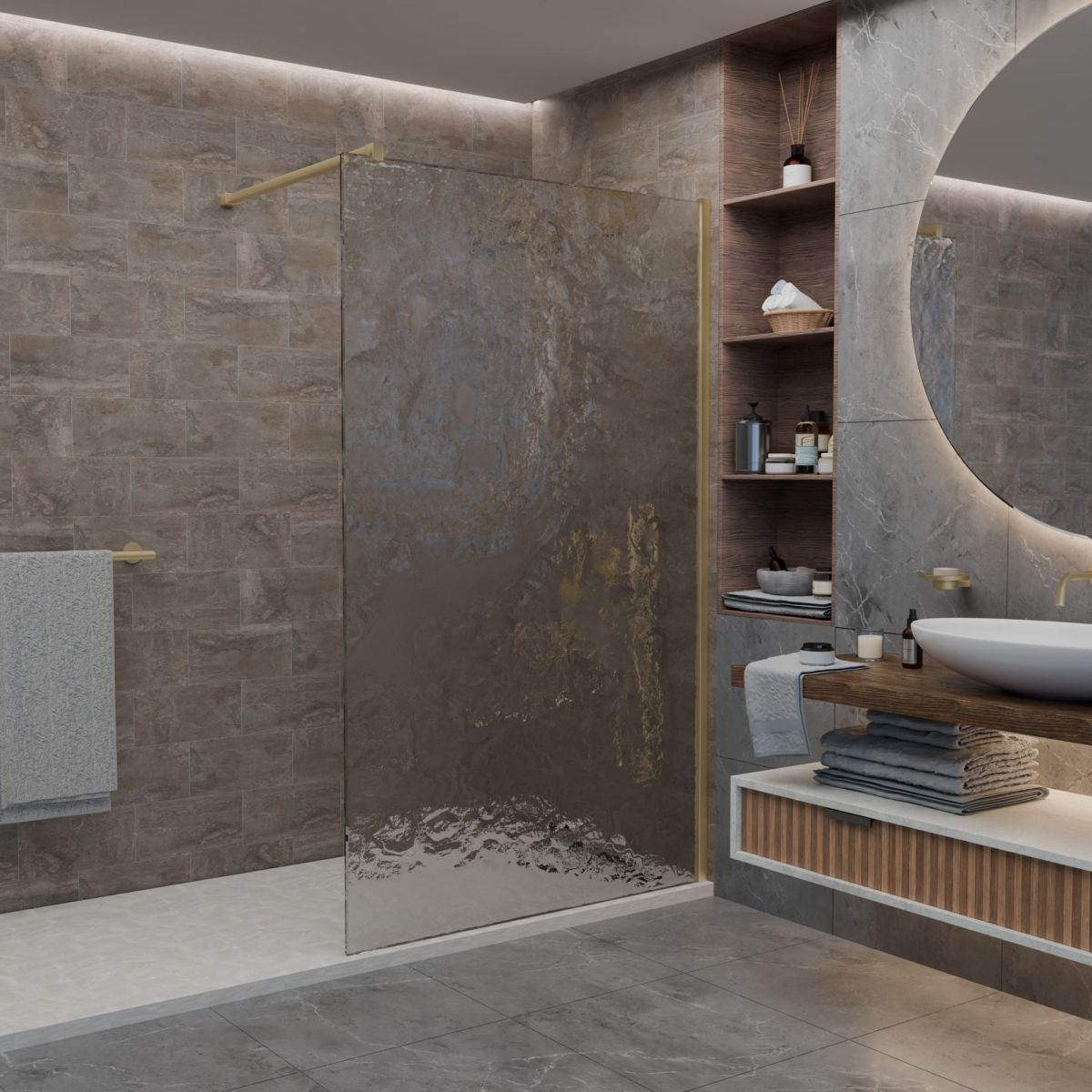 Трендовый дизайн стеклянной перегородки для душа: «Ледяное дыхание» (стекло Лёд). Этот дизайн превращает обычную функциональную зону в арт-объект и центральный элемент ванной комнаты, создавая атмосферу уюта, приватности и скандинавской свежести. Монтаж занимает всего около 3 часов.