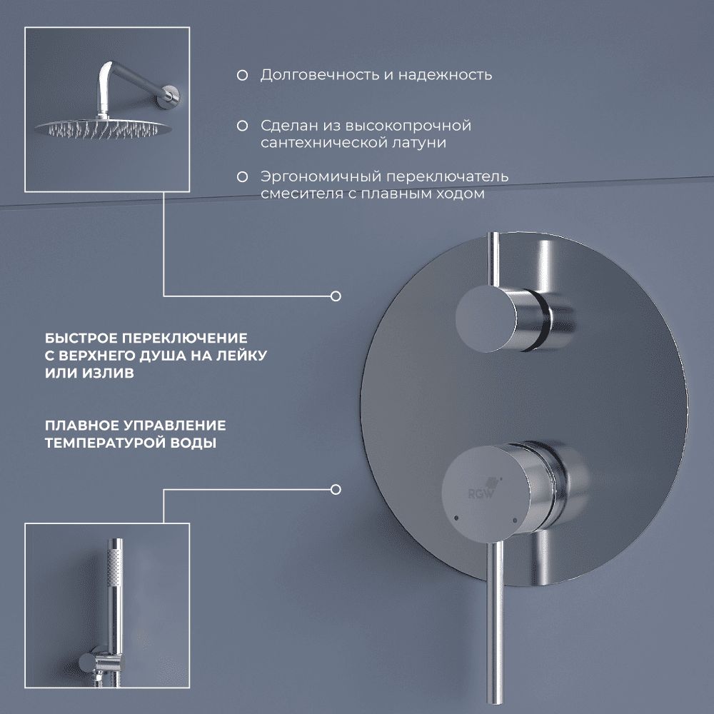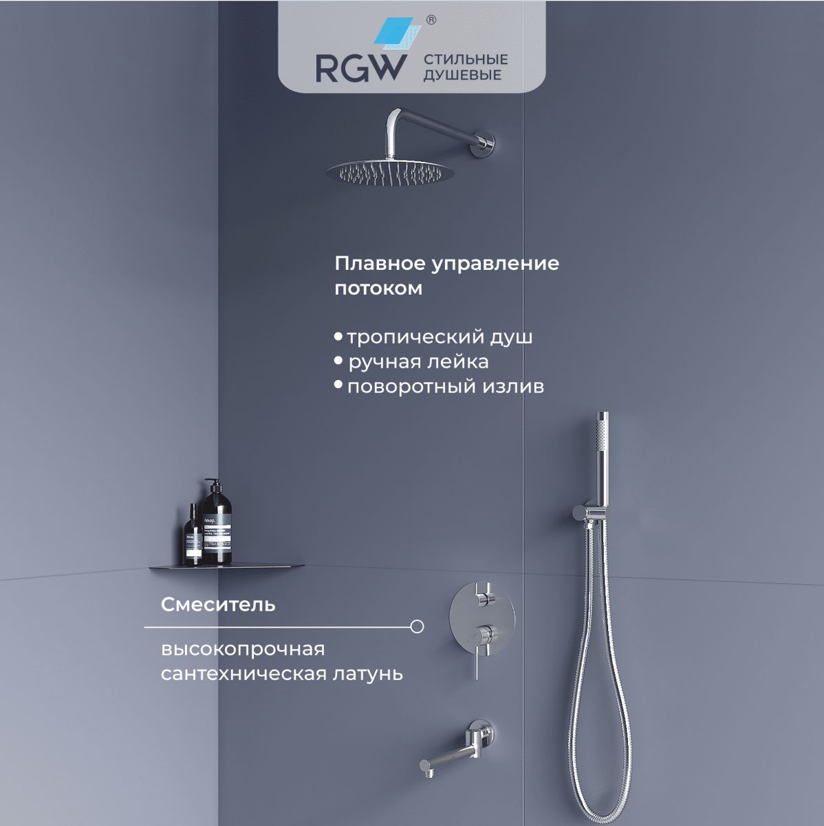 Душевые системы RGW с верхним душем гармонично вписываются в интерьер любой ванной комнаты за счет современного дизайна и продуманной эргономики.