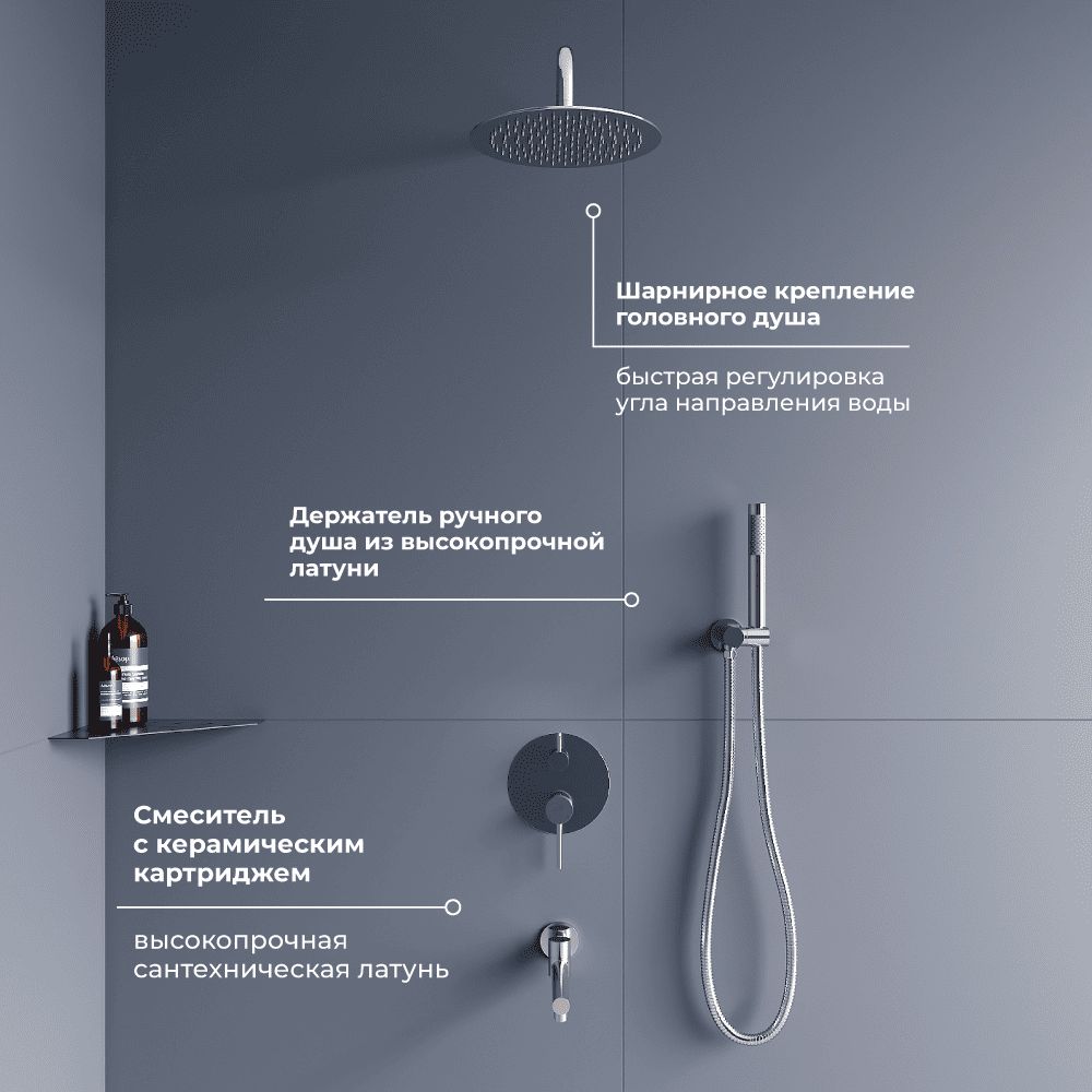 Встраиваемая душевая система выполнена из латуни и нержавеющей стали, что придаёт изделию повышенную устойчивость к образованию коррозии и ржавчины, а внутренний элемент оснащён керамическими пластинами. За счет применения передовых технологий душевые системы рассчитаны на ресурс эксплуатации не менее 10 лет.