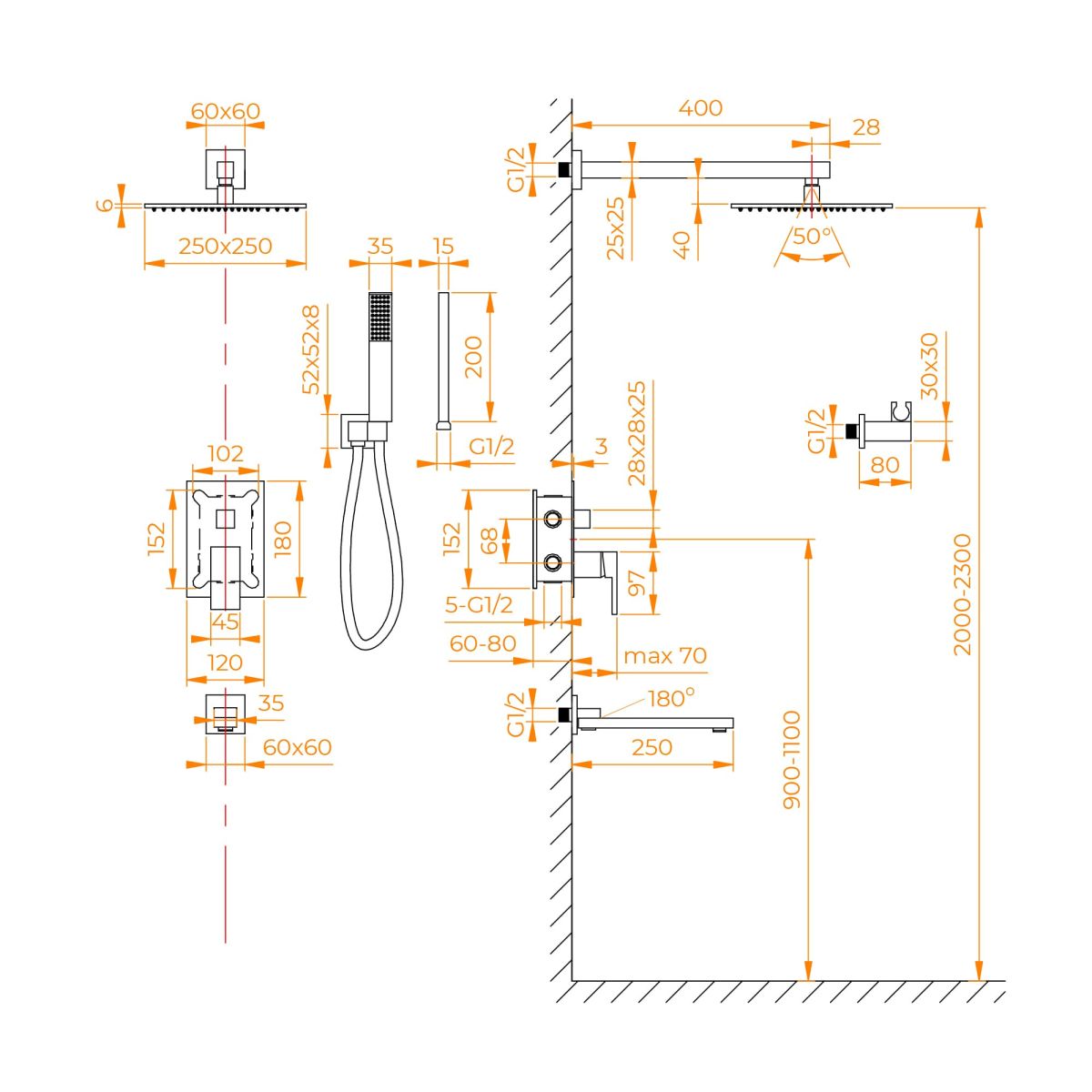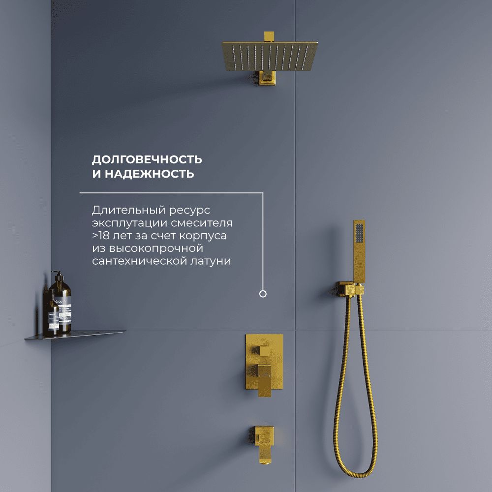 Встраиваемая душевая система выполнена из латуни и нержавеющей стали, что придаёт изделию повышенную устойчивость к образованию коррозии и ржавчины, а внутренний элемент оснащён керамическими пластинами. За счет применения передовых технологий душевые системы рассчитаны на ресурс эксплуатации не менее 10 лет.