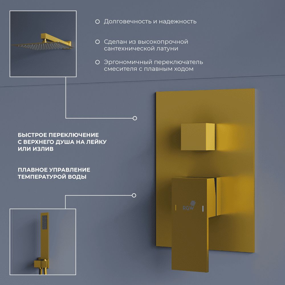 Душевые системы RGW с верхним душем гармонично вписываются в интерьер любой ванной комнаты за счет современного дизайна и продуманной эргономики.