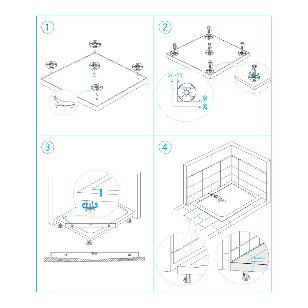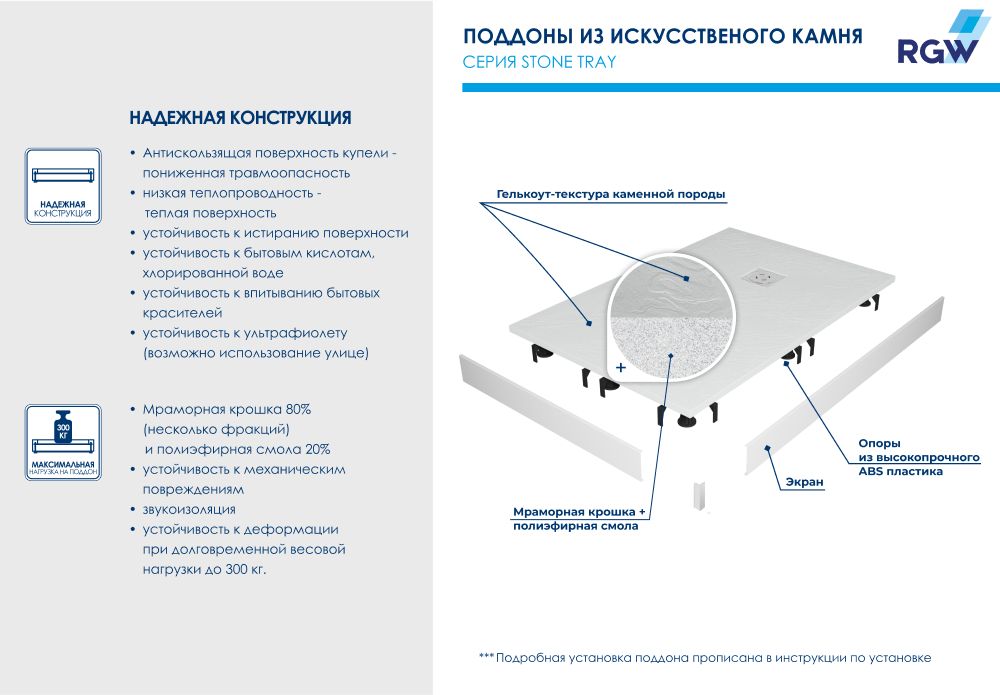 Душевые поддоны из искусственного камня, обладают высокой прочностью и долговечностью. Материал поддона позволяет резку по индивидуальным размерам. Поверхность поддонов рельефная, антискользящая. Нагрузка на поддон до 300 кг.