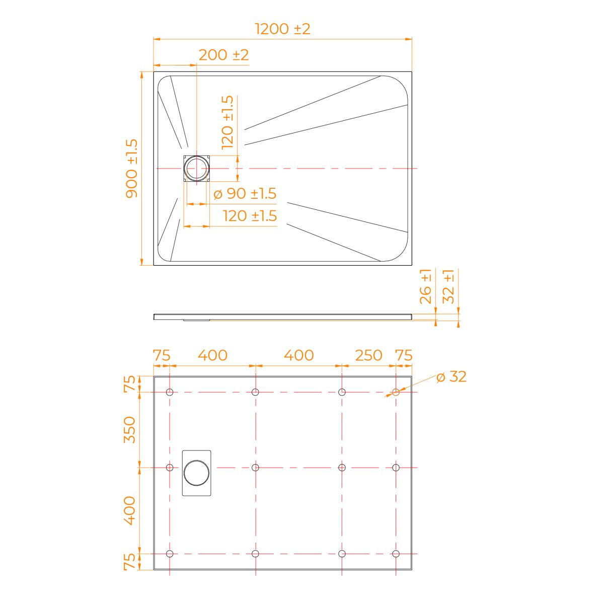 - Длина и ширина: от 800х1000 мм до 900х1200 мм. Поддон с широким размерным рядом даёт возможность подобрать оптимальный вариант для вашей ванной комнаты.