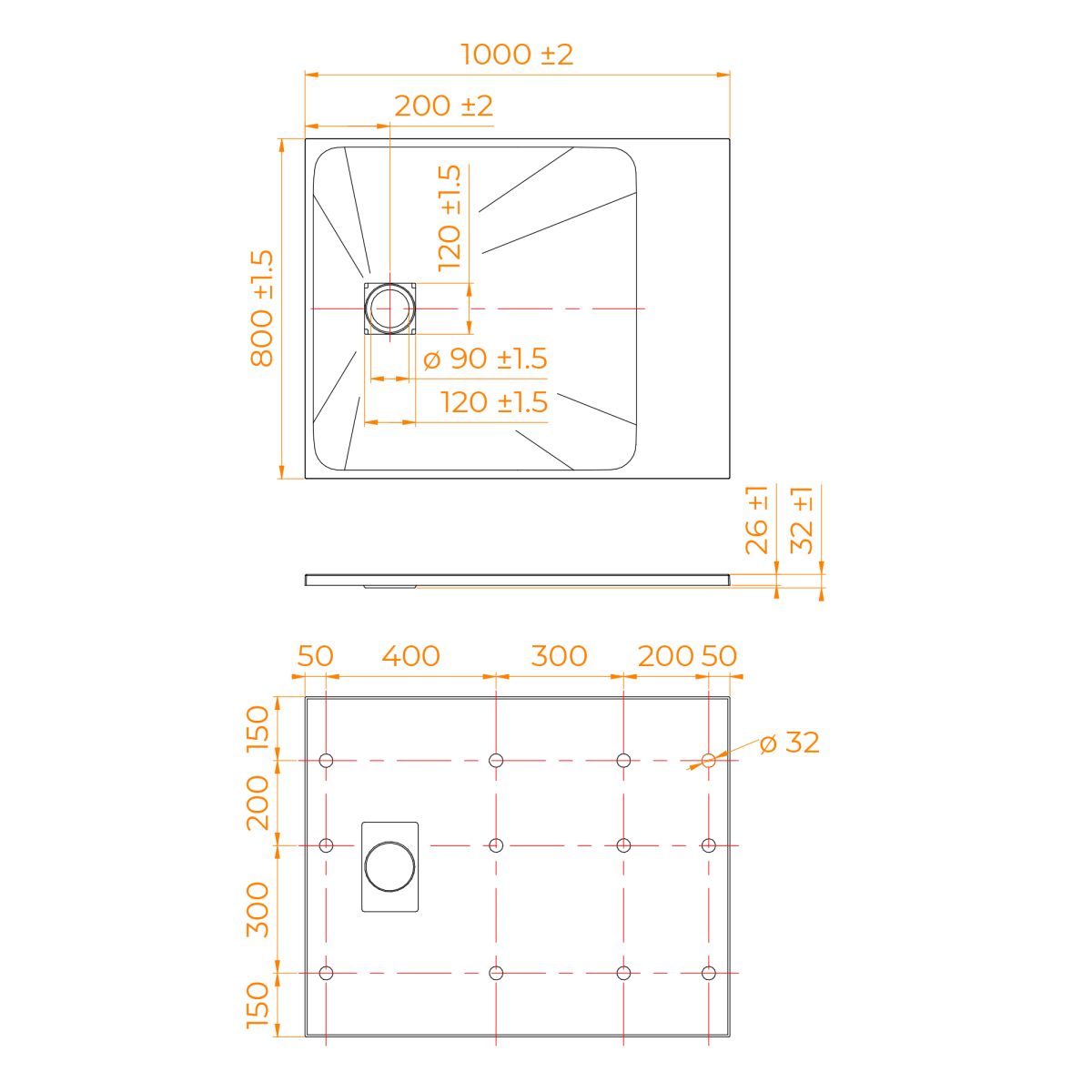 - Длина и ширина: от 800х1000 мм до 900х1200 мм. Поддон с широким размерным рядом даёт возможность подобрать оптимальный вариант для вашей ванной комнаты.