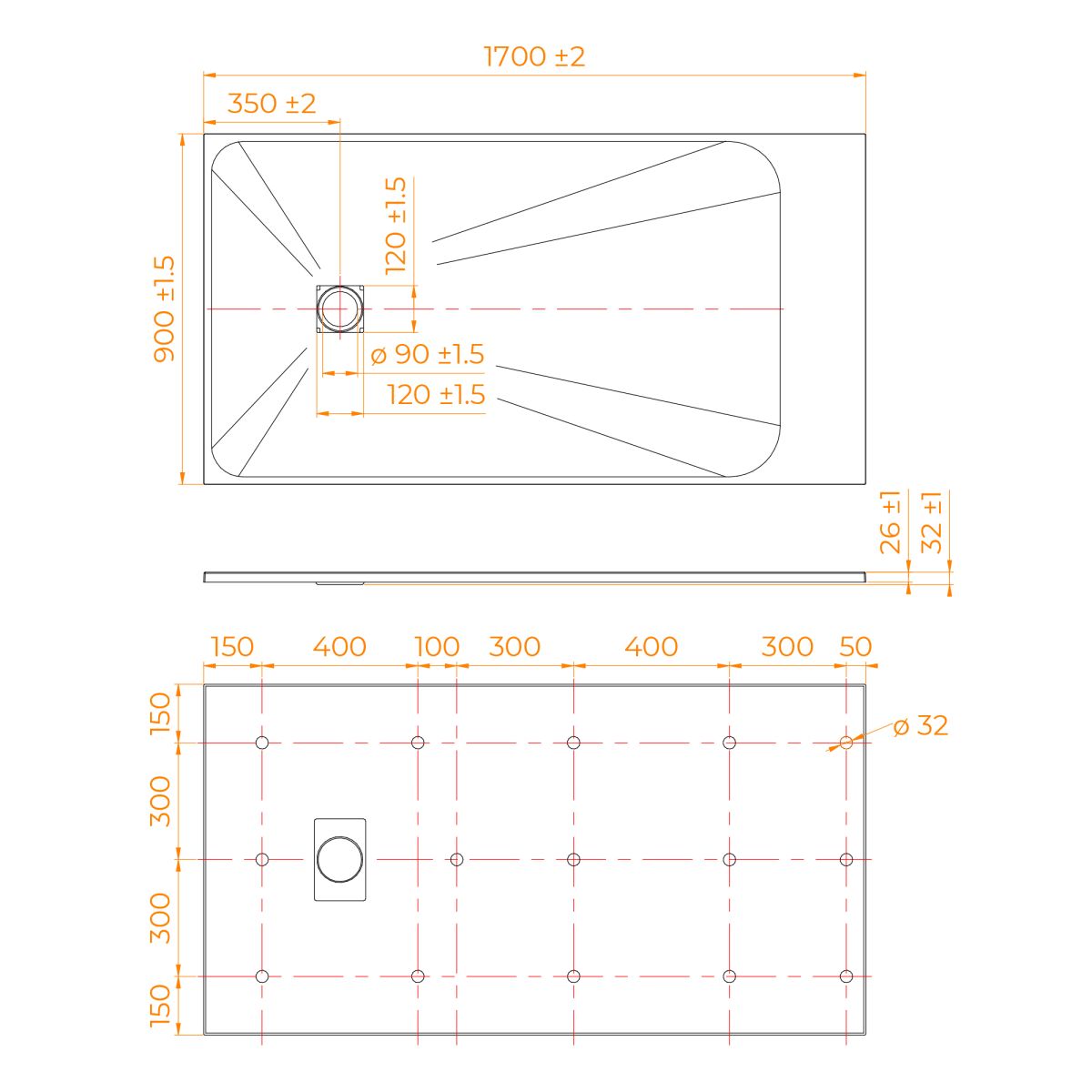 - Длина и ширина: от 800х1000 мм до 900х1200 мм. Поддон с широким размерным рядом даёт возможность подобрать оптимальный вариант для вашей ванной комнаты.