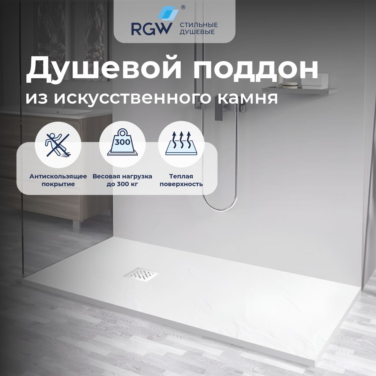 - Гибкость установки: при невозможности утопить сливные трубы в стяжку, можно установить поддон на ножки RGW N-01(10), а образовавшееся пространство закрыть экраном GW N/ST.