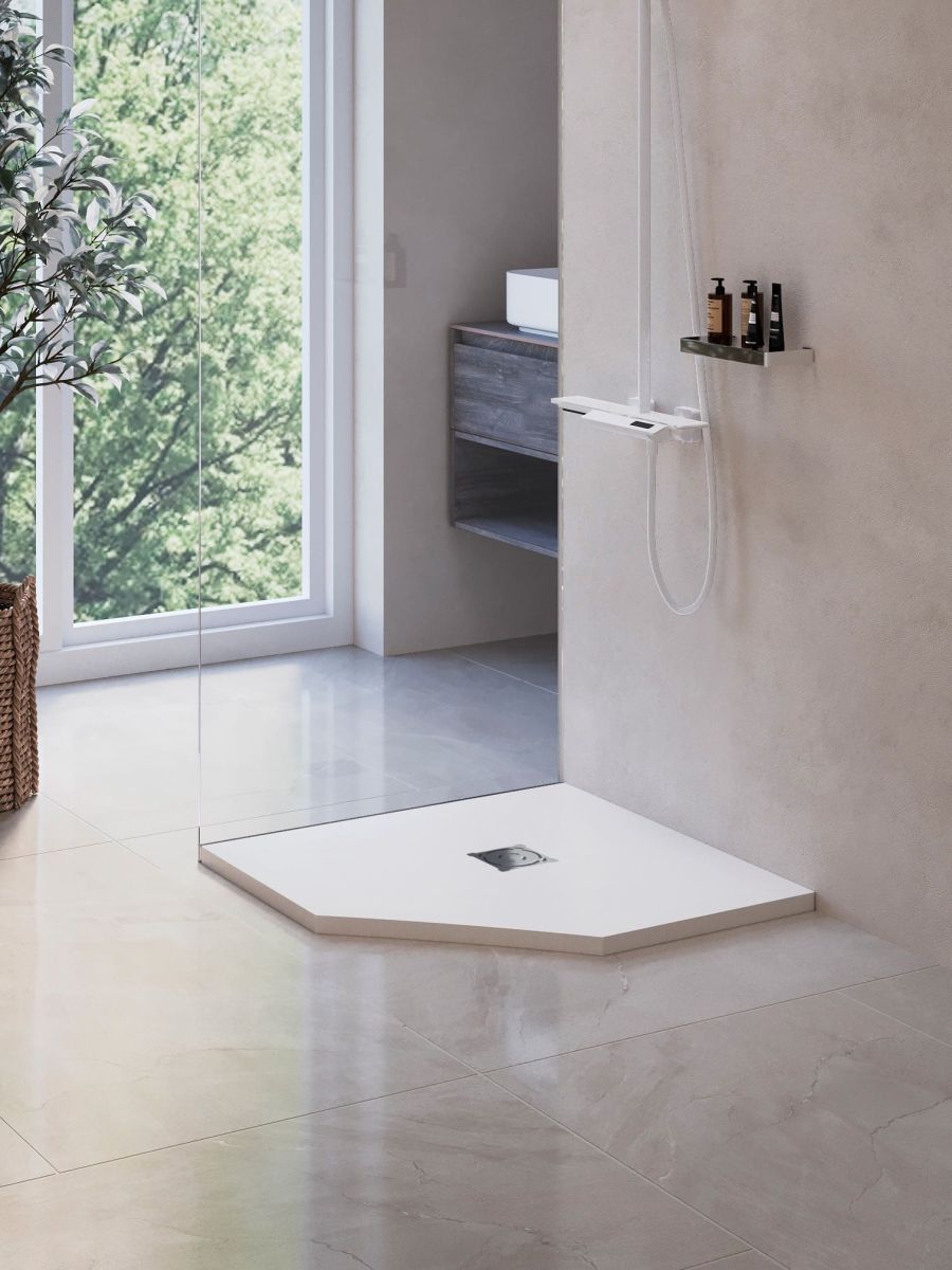 Новый поддон — это самостоятельный аксессуар вашей душевой. Универсальный цвет, откликающийся на уровень освещения, и текстура “под камень” идеально сочетаются с интерьерами от смелых лофт и хайтек до романтичного прованса, а решетка из нержавеющей стали, защищающая слив, создаст безупречный аккомпанемент душевым системам, а таком же оттенке.