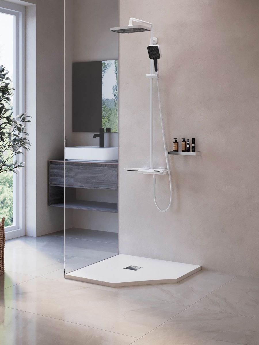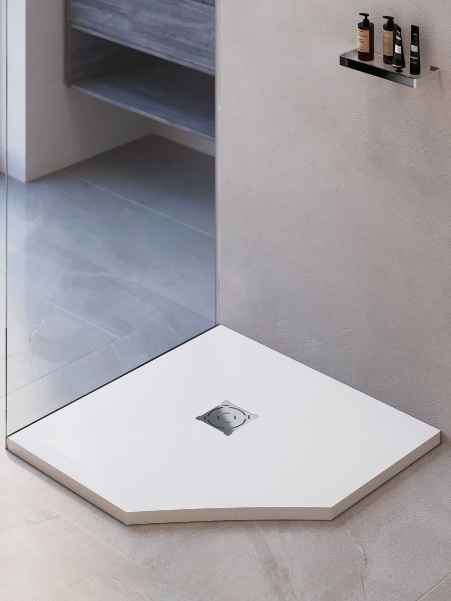 Новый поддон — это самостоятельный аксессуар вашей душевой. Универсальный цвет, откликающийся на уровень освещения, и текстура “под камень” идеально сочетаются с интерьерами от смелых лофт и хайтек до романтичного прованса, а решетка из нержавеющей стали, защищающая слив, создаст безупречный аккомпанемент душевым системам, а таком же оттенке.