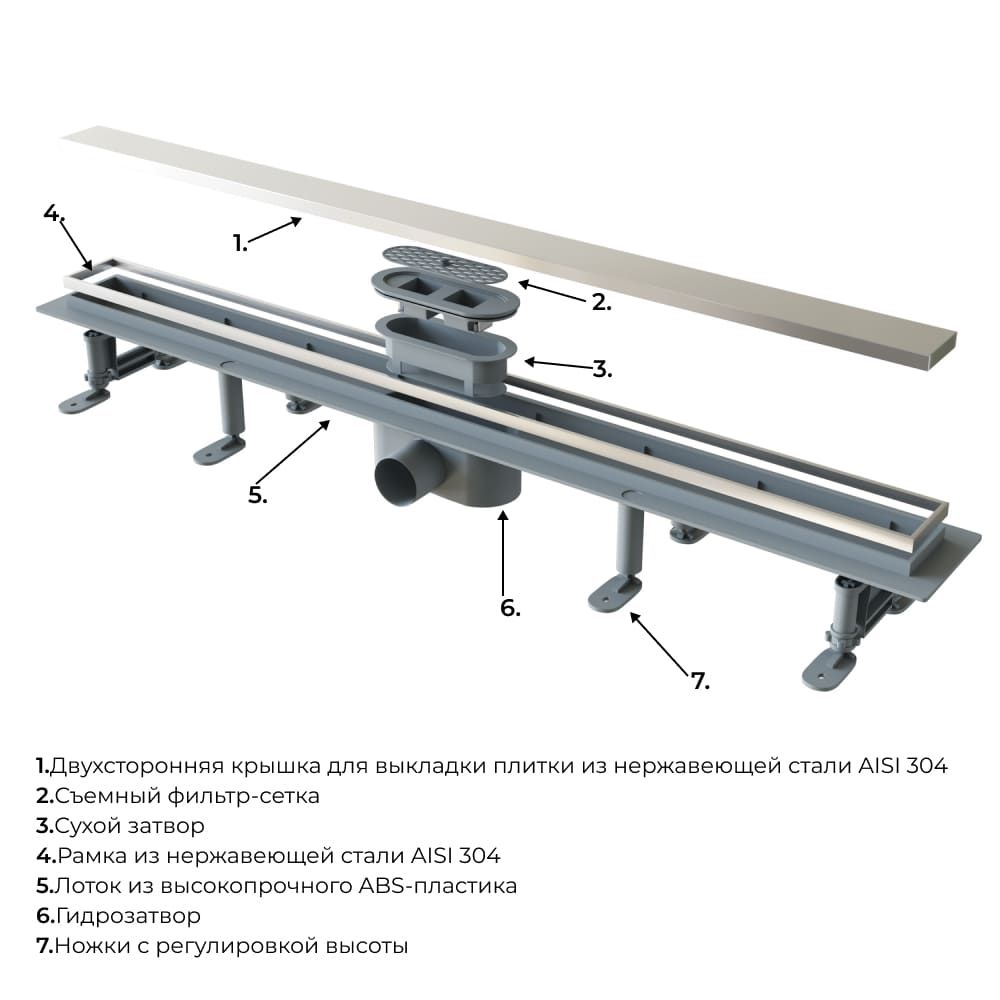 - Оснащен практичной двухсторонней крышкой-решеткой из нержавеющей стали AIS 304, позволяющей укладывать плитку, создавая эффект невидимого трапа.