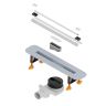 На этапе монтажа обязательно до укладки облицовочной плитки уложите вокруг лотка гидроизоляционная лента, которым комплектуется трап. Облицовочная плитка укладывается на вылеты лотка, что исключает неровной выкладки облицовочного материала и значительно облегчает монтаж сливного канала.
