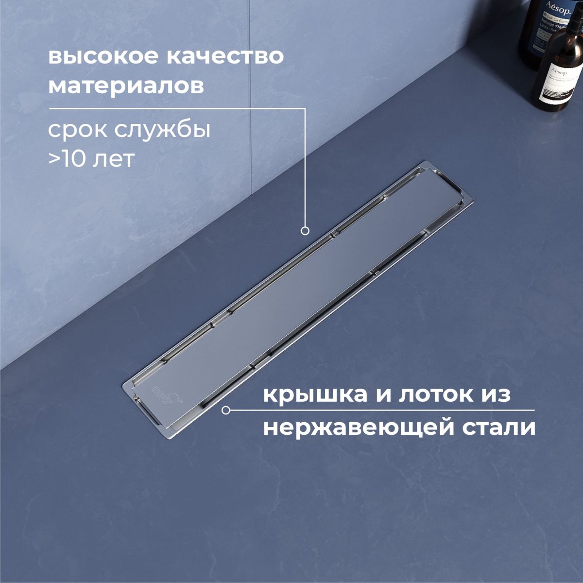 Лоток выполнен из нержавеющей стали ISIA 304, собирает стекающую воду и за счёт технического уклона отводит её в сетку-фильтр, которая задерживает волосы и мелкий мусор.
