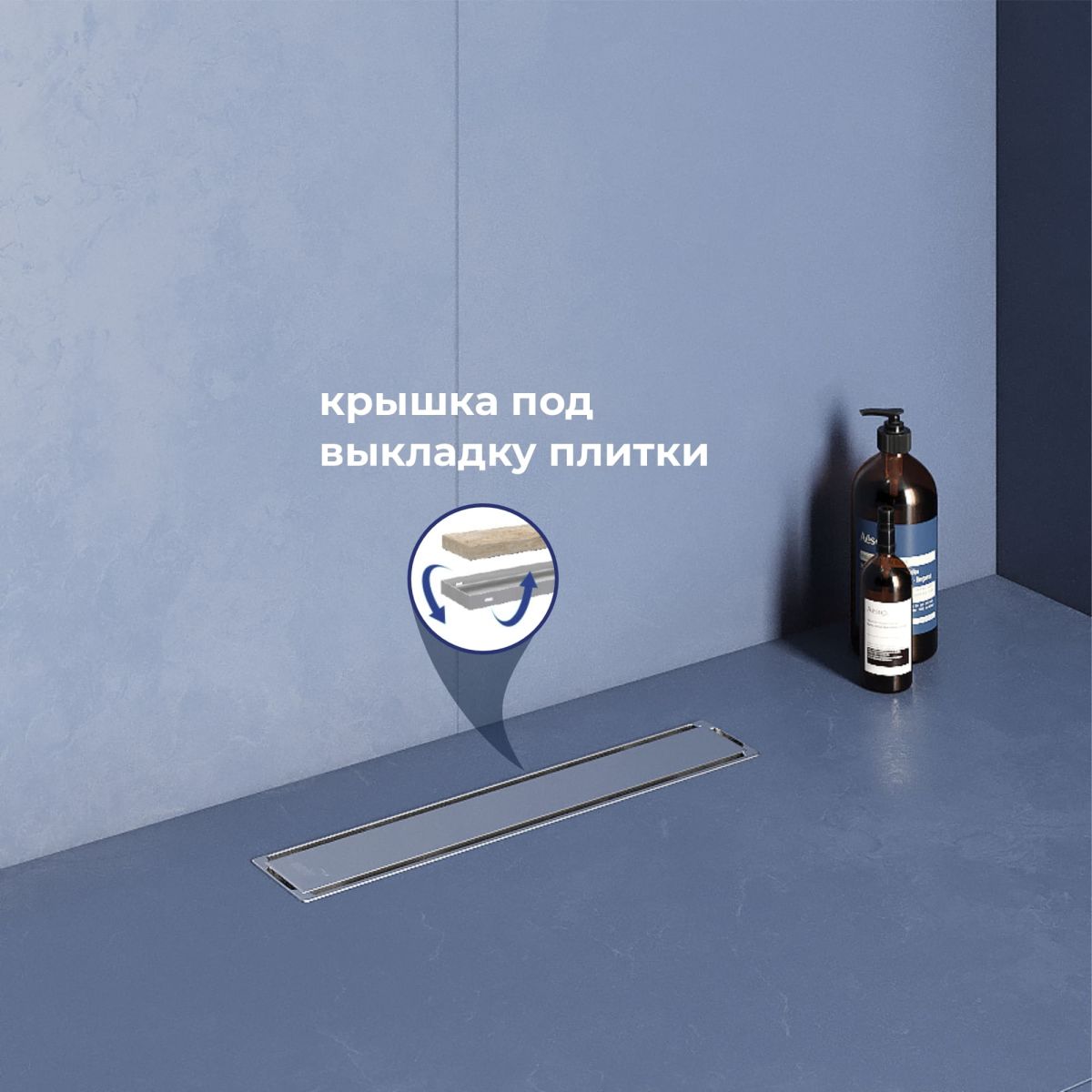 Декоративная крышка маскирует сливное устройство, вокруг неё образуется щель, куда сливается вся вода из душевого пространства. Для того чтобы вода эффективно отводилась в трап, на этапе монтажа необходимо обеспечить уклон облицовочной плитки в сторону принимающего жёлоба.