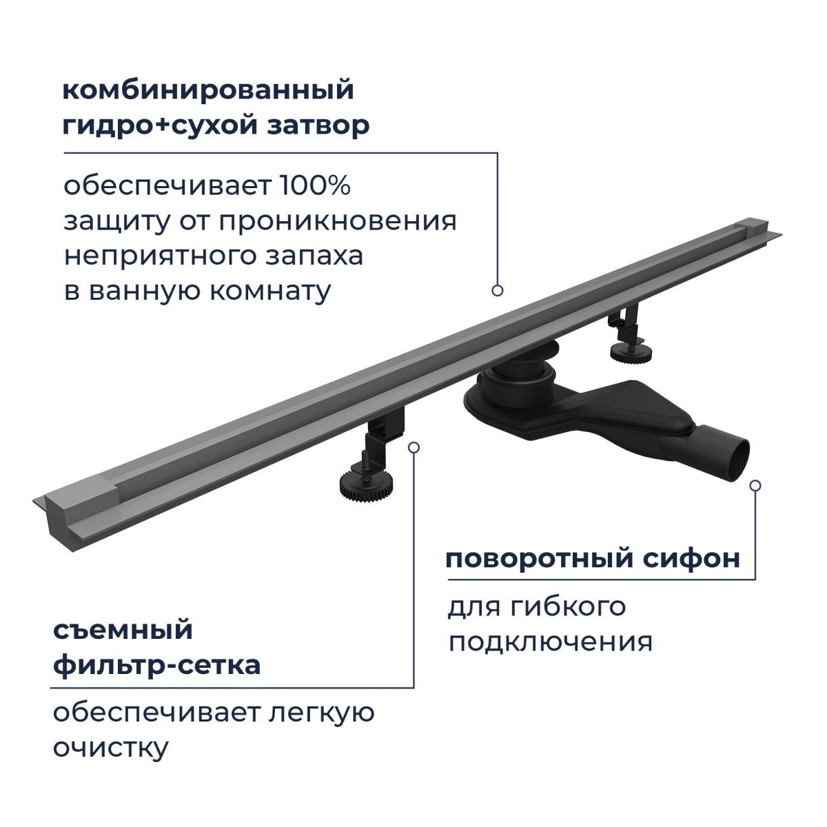 Конструкция трапа специально разработана, чтобы обеспечить быструю очистку сверху. Для качественного и быстрого доступа к внутренней конструкции сливной системы в комплекте присутствует специальный ключ, с помощью которого легко извлекаются все элементы: верхний сливной жёлоб с заглушками, сетка-фильтр — эффективный улавливатель волос и мелкого мусора, сифон с сухим затвором— можно просто промыть под проточной водой.