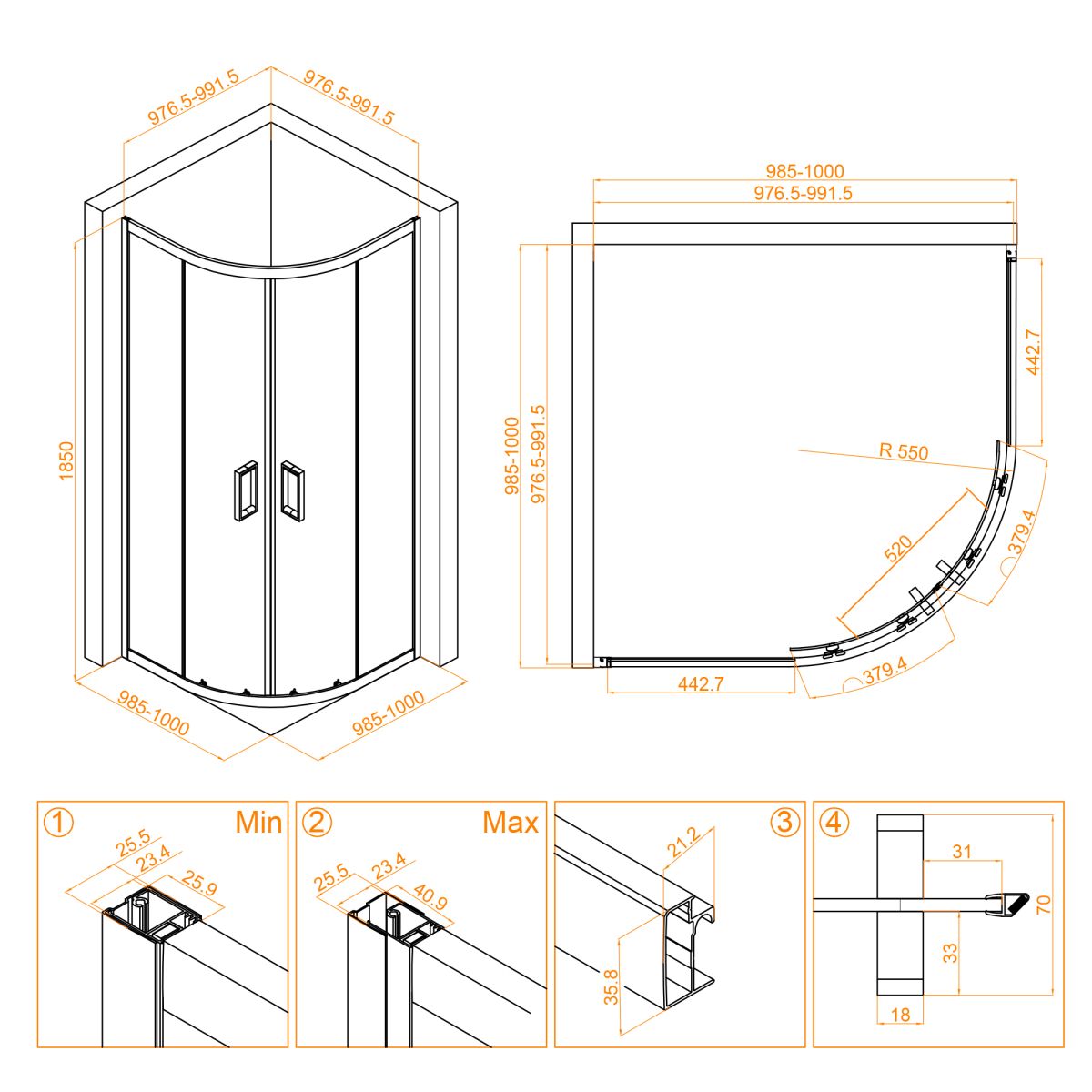 Стекло имеет покрытие анти капля Easy Clean, которое облегчает уход за душевым уголком и предотвращает появление пятен от воды и мыльной пены. Регулируемый профиль обеспечивает возможность регулировки размера уголка для того, чтобы он подходил для разных размеров ванных комнат.