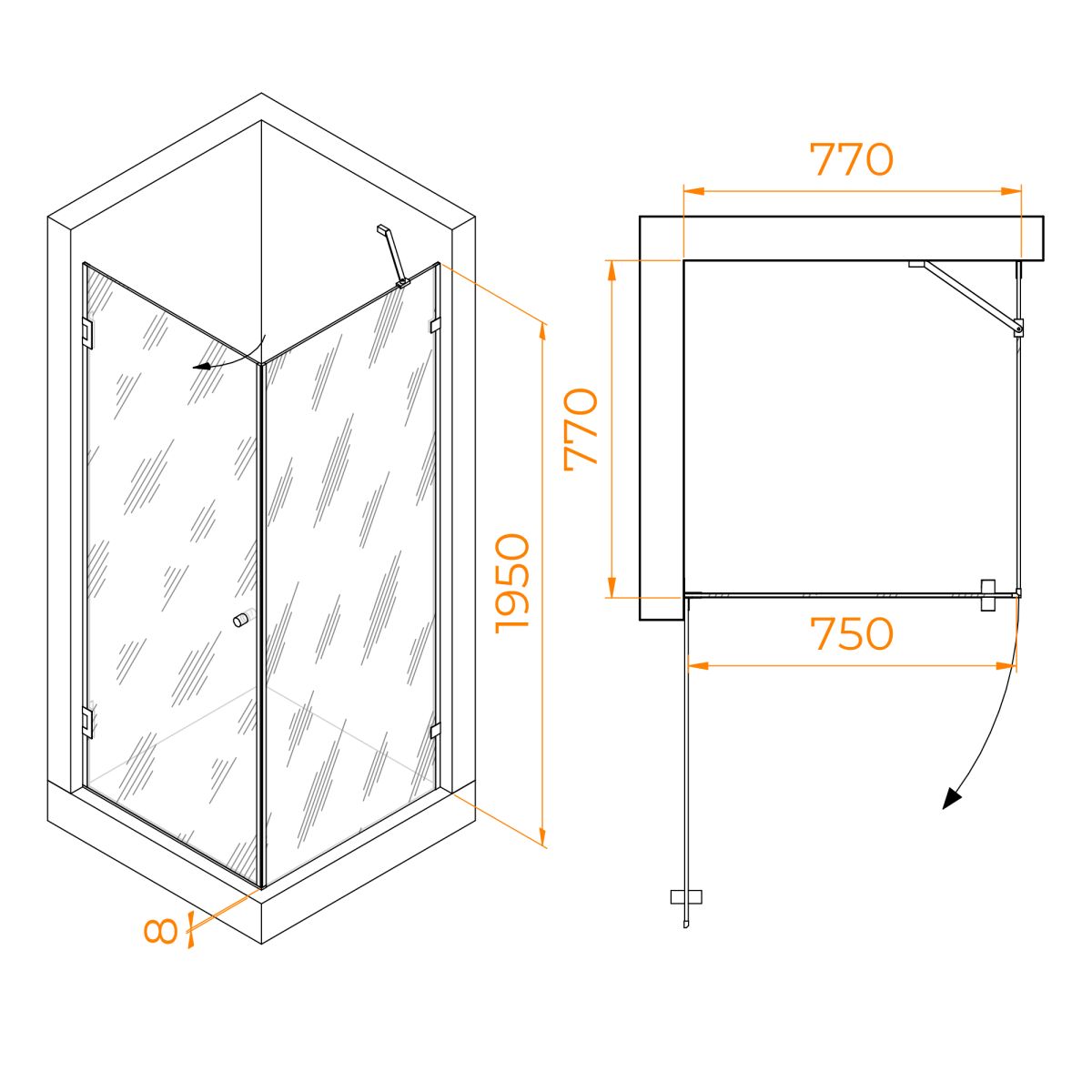 Конструкция душевого уголка квадратная, что позволяет его использовать в комнатах с различными метражами. Высота душевого угла составляет 1950 мм и отвечает современным требованиям к оборудованию ванной комнаты.
