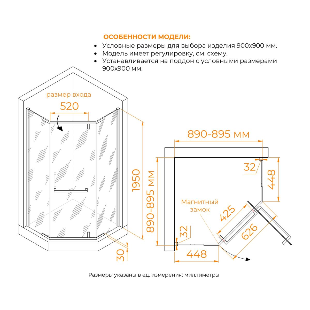 Высота душевого угла составляет 1950 мм, что делает его просторным и удобным для использования даже для людей с высоким ростом. Каждая деталь была изготовлена с учетом комфорта и безопасности в использовании.