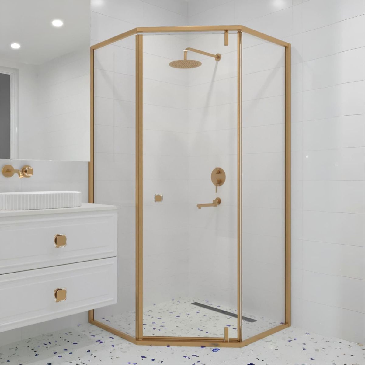 Для описания душевого ограждения мы выбрали термин душевой уголок по форме трапеция не случайно, ведь по геометрической фигуре стёкла выставлены так, что на полу они отображают именно равнобедренную трапецию. Почему назвали душевой уголок «пятиугольный», потому что количество углов в этой кабине будет пять.