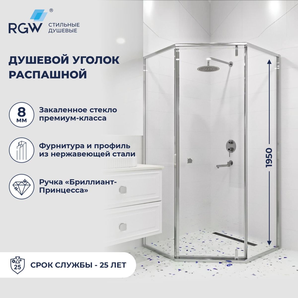 Душевой уголок, стекло 8 мм, пятиугольный, форма трапеция, распашная дверь, ручка бриллиант - RGW HO-088